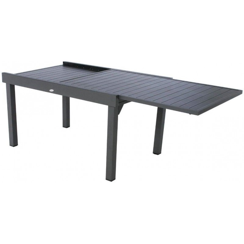 Table PIAZZA de marque HESPERIDE conçue pour l'extérieur assortie aux fauteuils, chaises et salon détente de cette collection. Table extensible pouvant recevoir jusqu'à 10 convives. Pliée, elle ne mesure que 135x90 cm et encombre peu mais dépliée, elle mesure 270x90 cm. Hauteur 75 cm. Extensible gr ce à son 2ème plateau qui coulisse sous le plateau principal en quelques instants. En aluminium traité époxy contre la rouille, coloris noir très légérement moucheté dit graphite. A monter soi-même. Table vendue seule sans fauteuil.