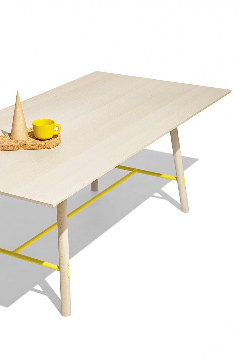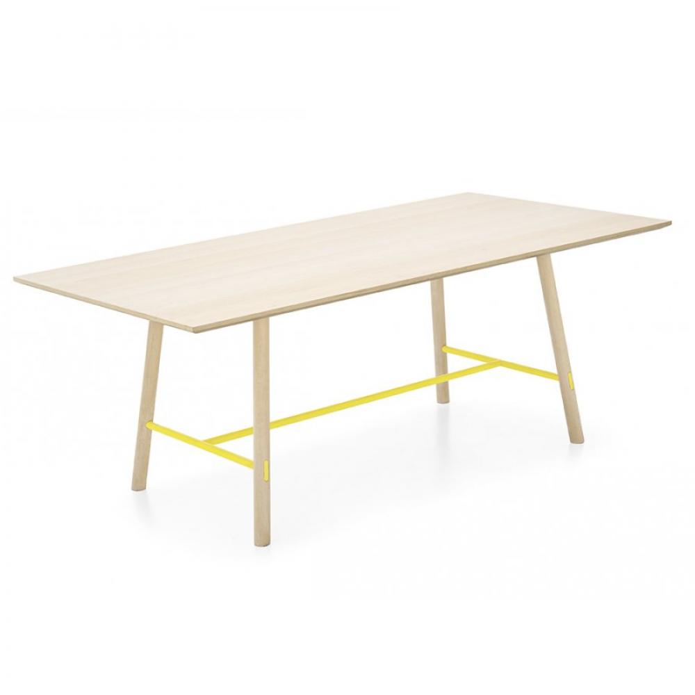 Table repas 6 couverts YO! 160 cm pieds et plateau plaqué hêtre croix en métal jaune