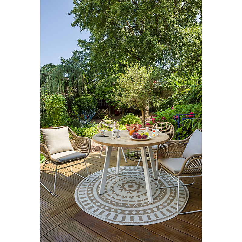 Table à manger extérieure ronde en bois de teck Ø 105 cm Flores de Jardiline pour 4 personnes, parfaite pour petite terrasse ou pour balcon. Table de jardin ronde en teck Ø 105 cm Flores - Jardiline La belle petite table à manger extérieure Flores pour 4 personnes vous accompagnera durant les beaux jours pour des repas dans le jardin. Cette table ronde en teck possède un charme tentant, grâce à la chaleur de son bois et son design épuré et subtil. Sa structure en acier traité vous assure une grande durabilité et une solidité contre la vie quotidienne. Que ce soit pour prendre le déjeuner et pour apprécier les premiers rayons du soleil, ou pour un bon repas autour d'un barbecue en fin de journée, cette table à manger extérieure en bois vous assure de bons moments en plein air. Dimensions de la table (L x l x H) : 105 x 105 x 72,5 cm Matériau : acier traité / bois teck À monter soi-même Caractéristiques techniques Collection:Flores Couleur:Beige Dimensions (Ø x H):105 x 72,5 cm Extensible:Non Forme:Ronde Garantie:2 ans Marque:JARDILINE Matière(s):Bois Nombre de places:4 Pliante:Non Poids:21 kg