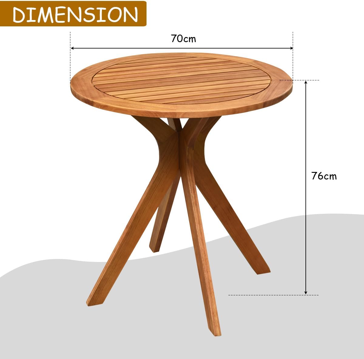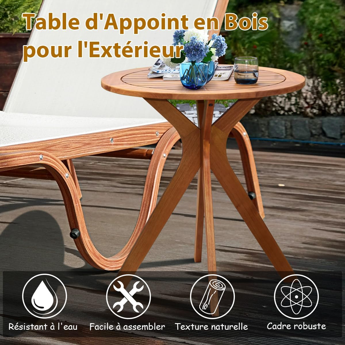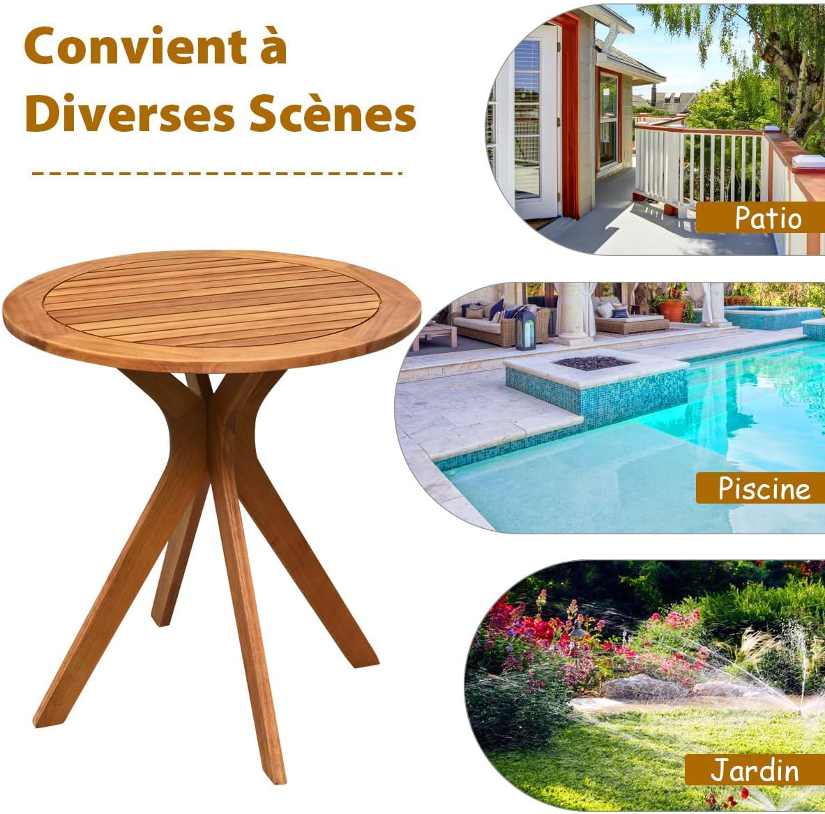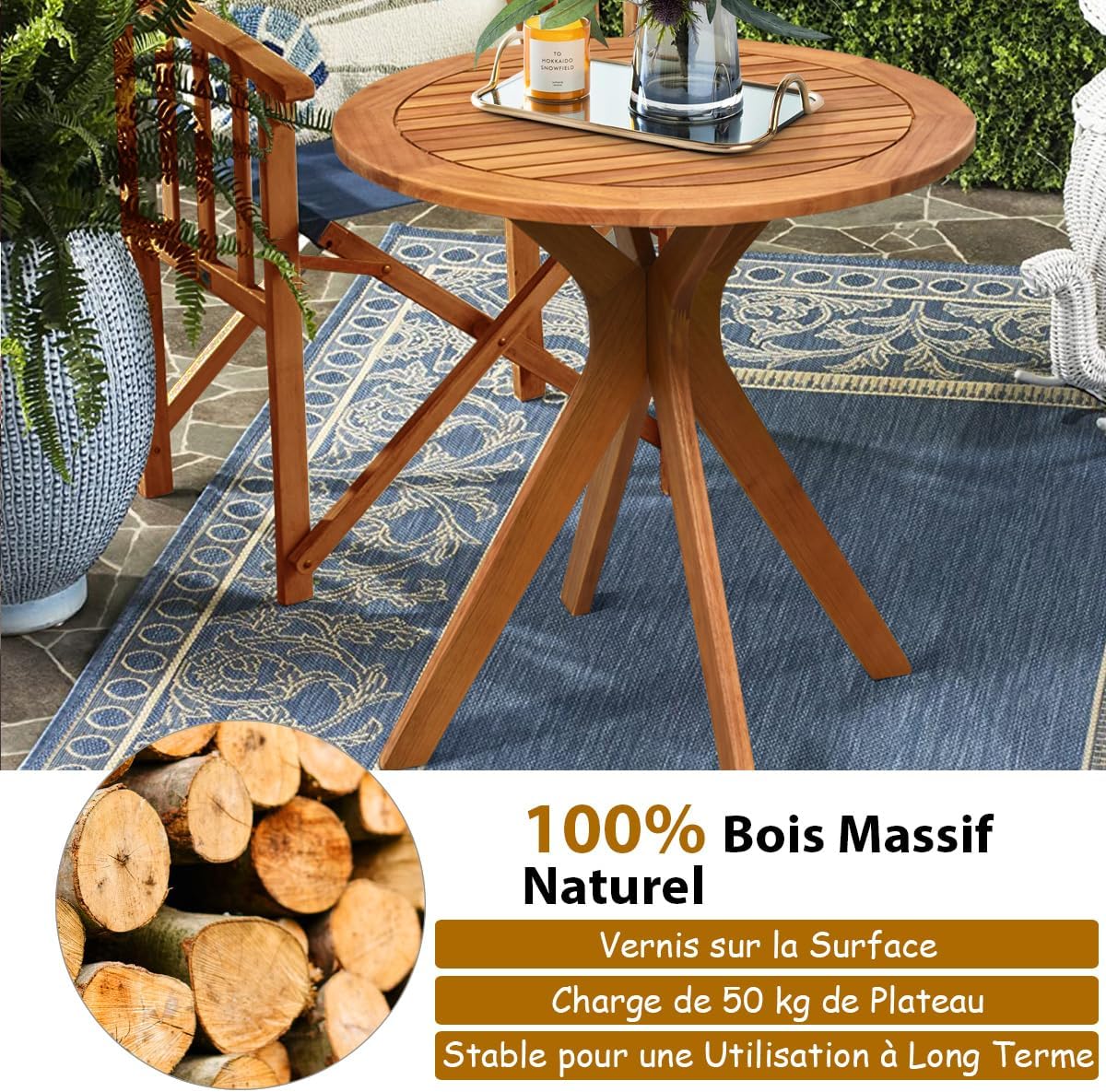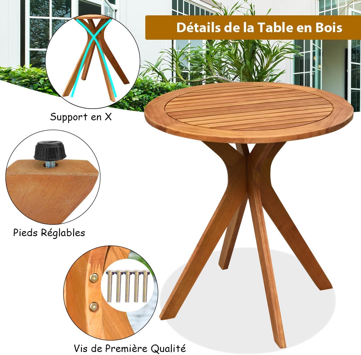 Libellé Table ronde jardin en bois acacia avec pieds en croix, table de service terrasse style moderne et simple pour jardin, cour, patio, table de bistrot