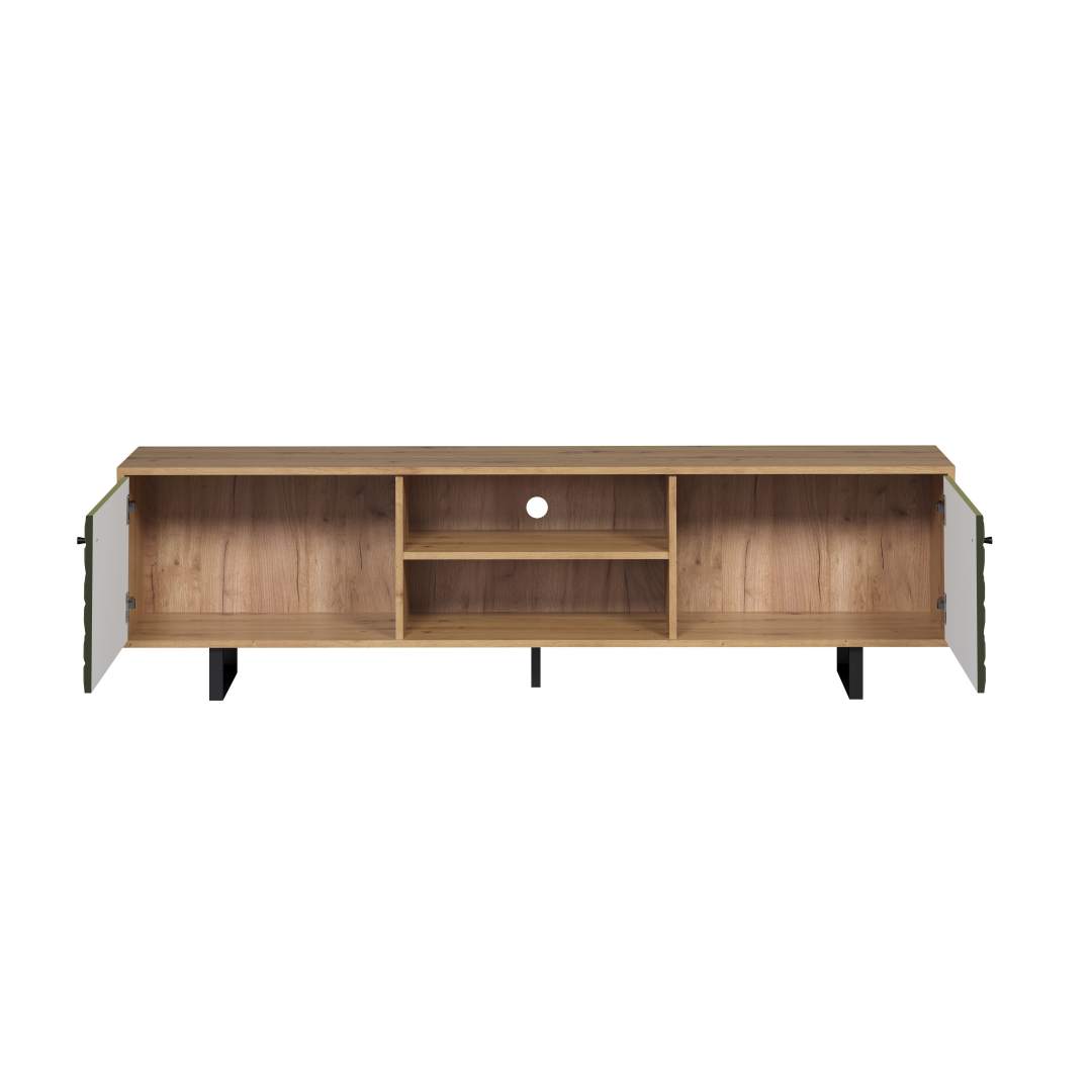 Meuble TV Sentra vert, décor chêne est un meuble TV de couleur verte qui apporte à la fois style et fonctionnalité à votre maison. Meuble TV Sentra vert, décor chêne. Sans lumière. Ce produit est créé avec un souci du détail, ce qui garantit à la fois un attrait esthétique et une grande durabilité. Il est conçu dans un souci à la fois de fonctionnalité et de style, ce qui en fait le choix parfait pour n’importe quelle pièce de votre maison. Les matériaux utilisés sont de haute qualité, ce qui confère au produit une longue durée de vie et lui permet de résister à une utilisation quotidienne. Que ce soit pour le rangement ou comme ajout décoratif, ce produit rehaussera votre décor et apportera plus de confort et d'élégance à votre maison.