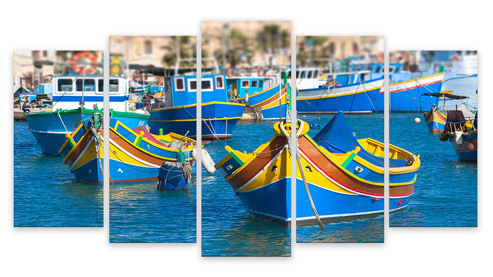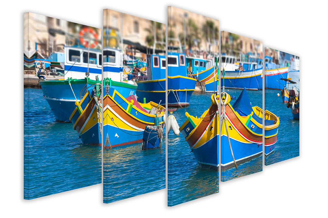 | Libellé | Tableau 5 parties Tableau photo bateaux de pêches colorés , malte - 150x80 cm |
