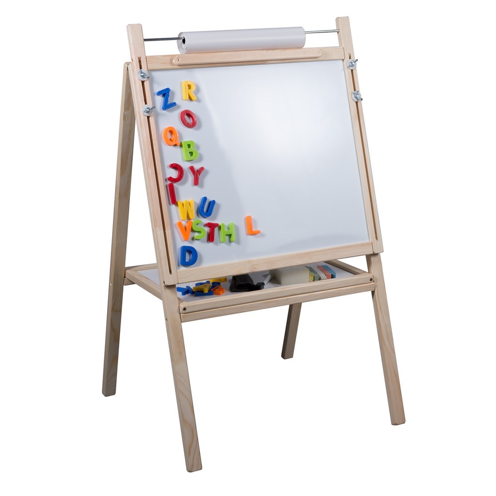 Un tableau sur pieds avec un côté tableau noir pour les craies et un côté tableau blanc magnétique pour les feutres marqueurs et les aimants. Grace à son rouleau de 15m de papier ce tableau fera entrer le monde de l'école dans la chambre de votre enfant ! Dimension : Hauteur : de 85 à 120 cm Largeur : 55 cm Contient : 1 feutre 5 craies 1 éponge des lettres aimantées 1 rouleau de papier Rouleau de papier supplémentaire également disponible dans notre boutique