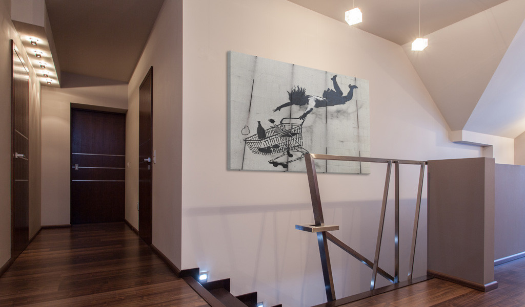 Tableau Femme tombe avec un chariot de supermarché (Banksy)-Taille L 60 x H 40 cm