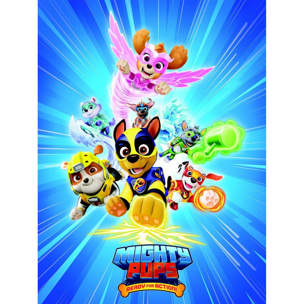 Le tableau représente les personnages principaux de cette serie d'animation qu'est Pat'Patrouille. Nous retrouvons Chase, Marcus, Ruben, Rocky, Stella, Zuma ou encore Everest. L'ensemble de ces personnages, partent en mission au premier plan sur le tableau. Ils sont déterminés avec un effet de vitesse clair donné au visuel. Le tout sur un fond bleu clair et foncé. Sur le tableau il est écrit en grand Mighty Pups - Ready to Action.