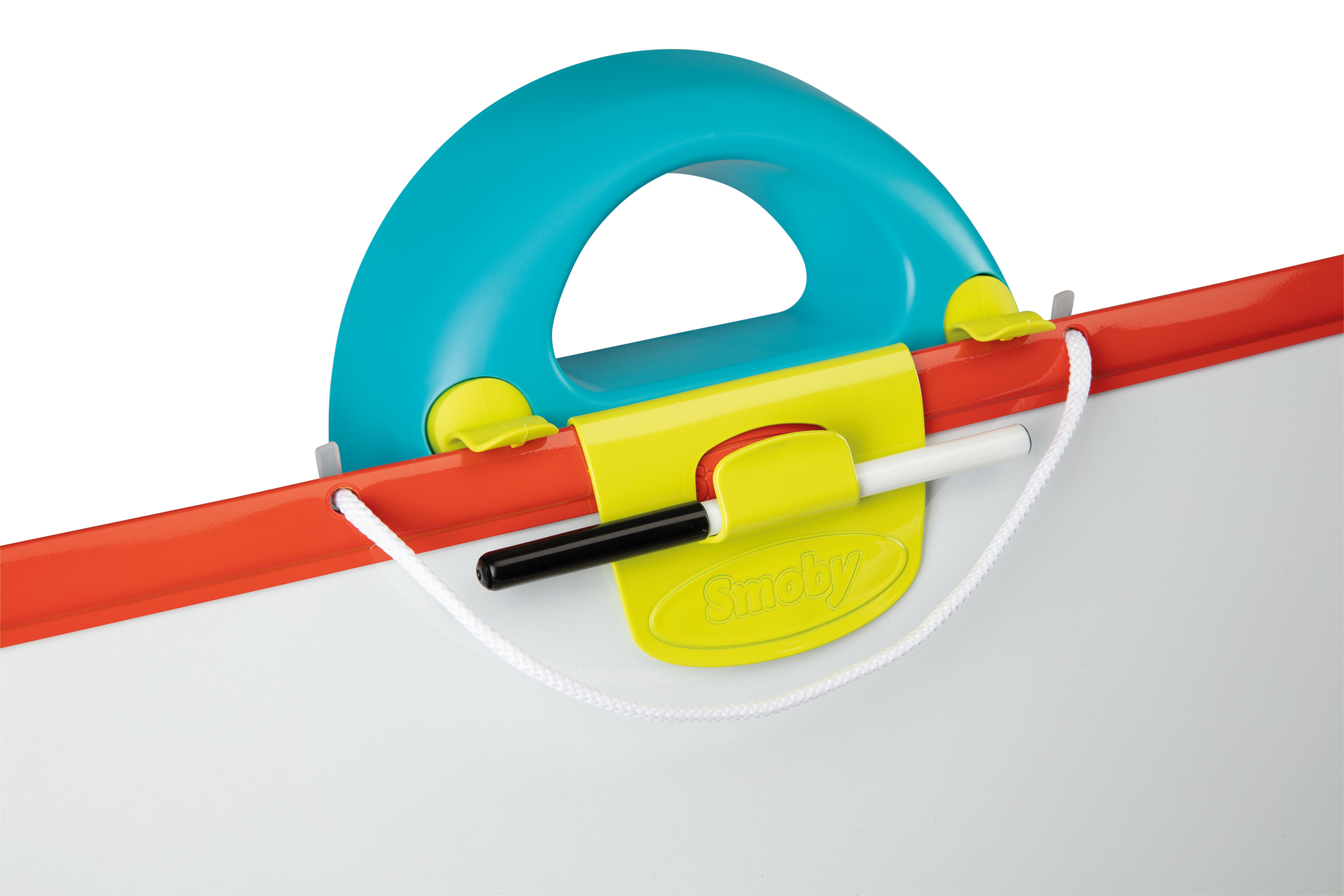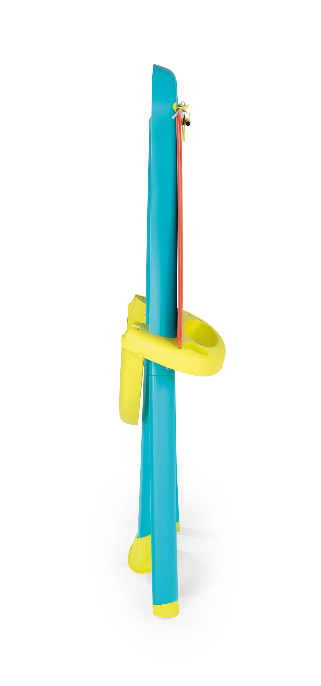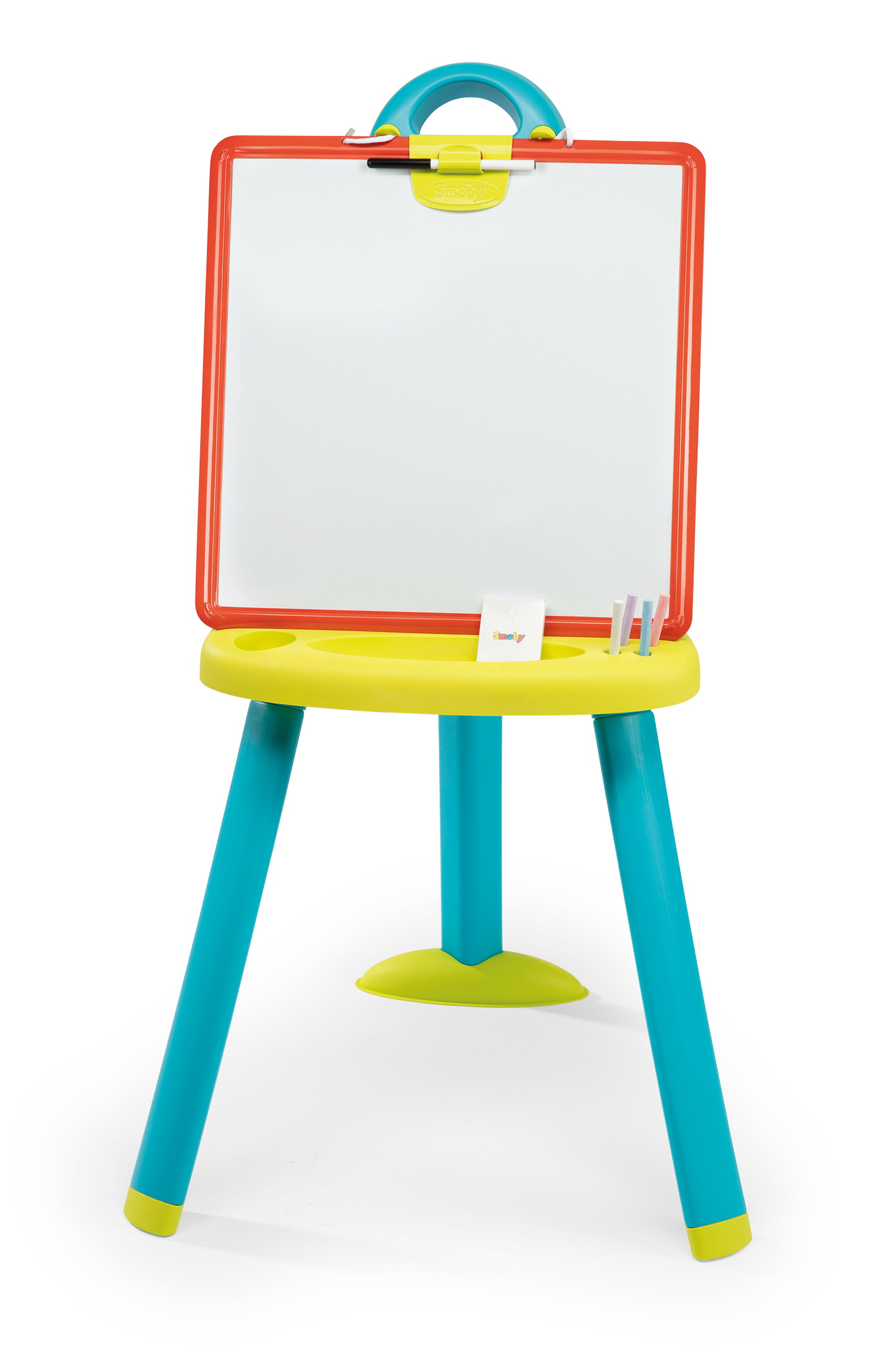 Tableau en plastique avec une ardoise double face comportant une face blanche magnétique et une face craie. Légère et résistante aux chocs, elle peut facilement être retournée et se clipser sur la structure en un seul geste ! Un plumier fonctionnel est disposé sous l'ardoise : il est composé d'un grand bac de rangement et de 5 emplacements pour pots à peinture, craies et feutres. Ce tableau est très stable avec ses trois pieds munis d'embouts antidérapants. Tableau pliable pour un rangement facile. 1 feutre effaçable et 6 craies inclus. Large surface d'écriture : 43 x 43 cm. Hauteur : 105 cm. A partir de 3 ans. Fabrication française.