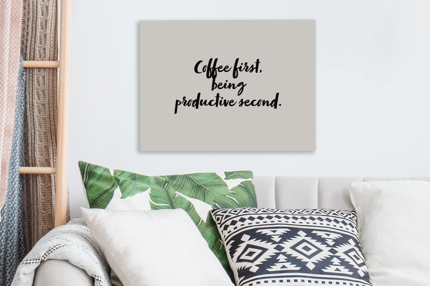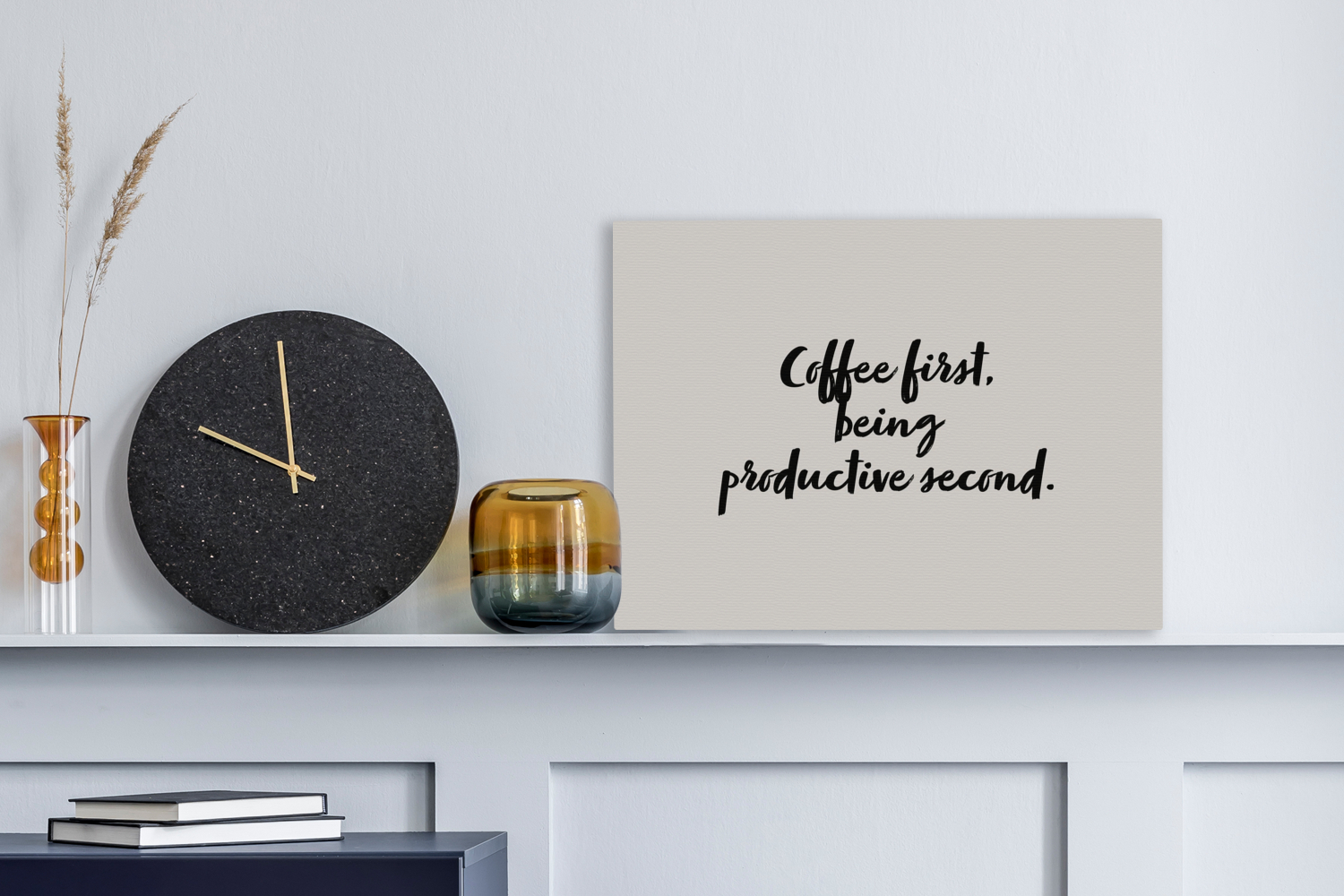 Passer le carrousel d'imagesLa citation : "Le café d'abord, être productif ensuite". sur un fond taupe.