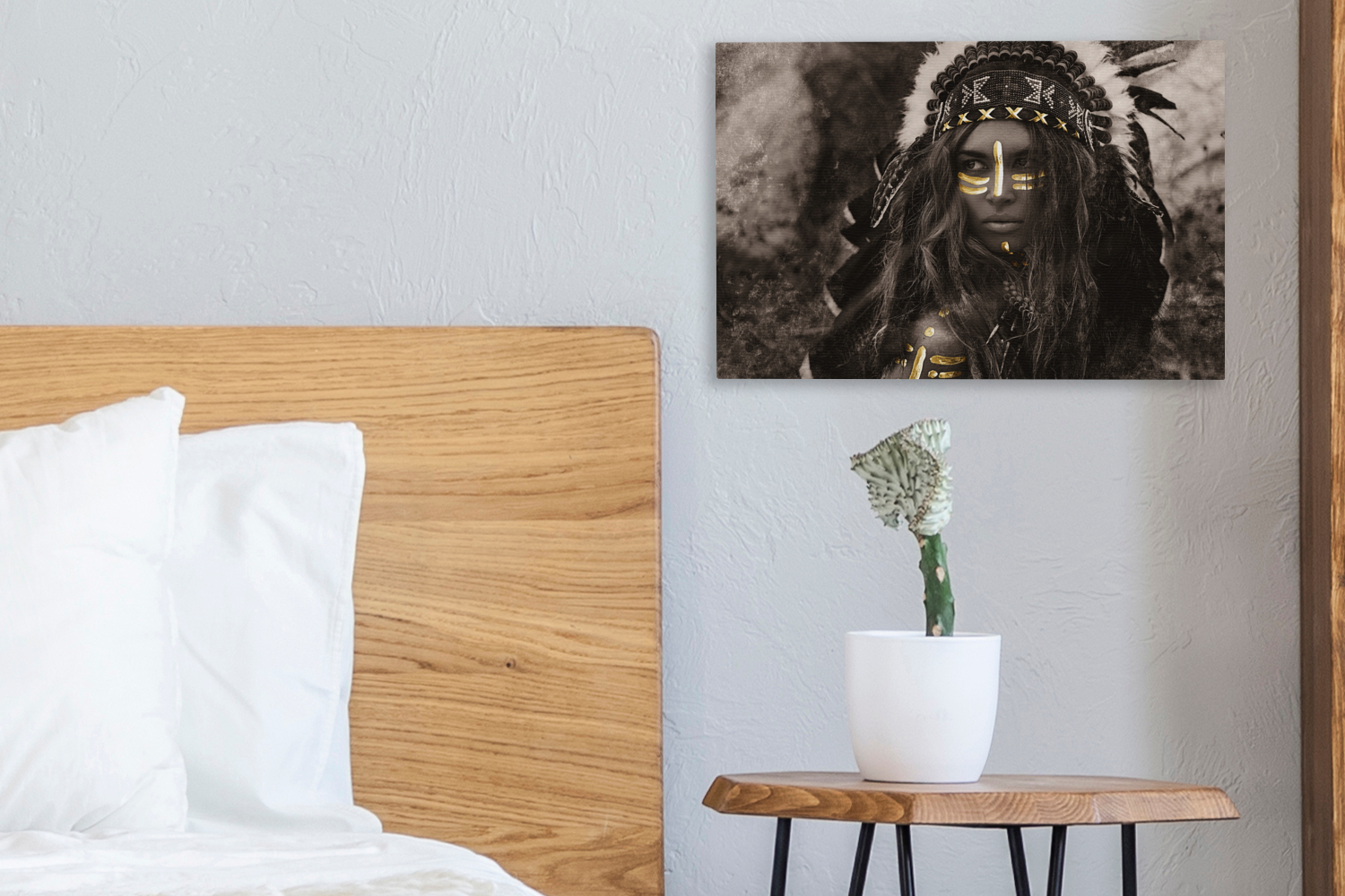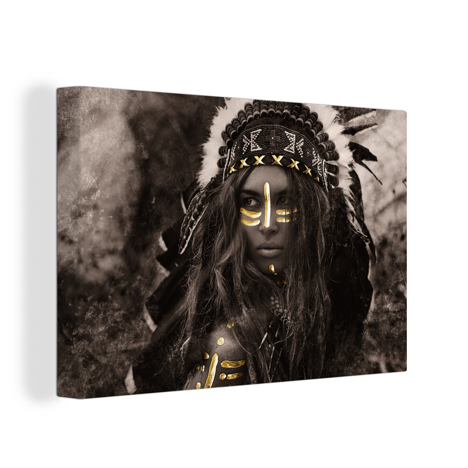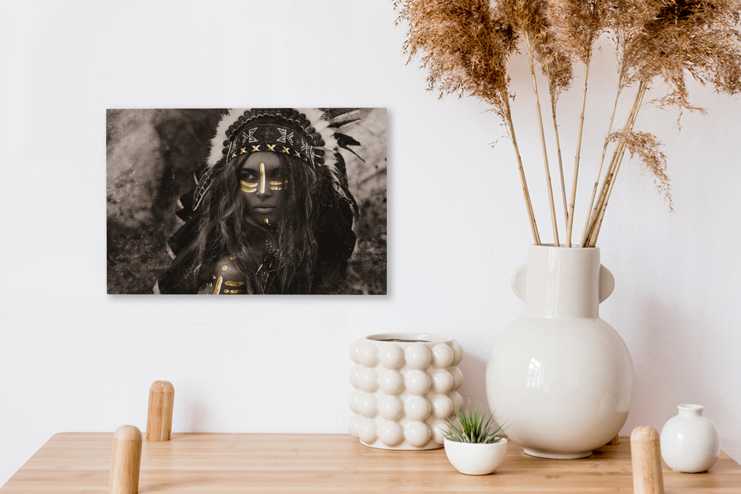 Portrait en noir et blanc d'une femme avec une coiffe indienne et des rayures dorées.