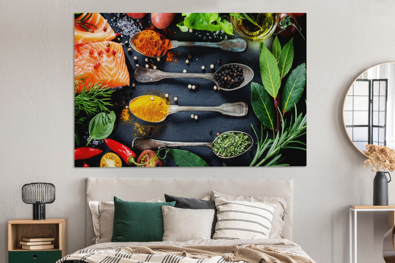 Tableau sur toile Herbes - Cuillères - Cuisine - Épices Decoration murale 150x100 cm