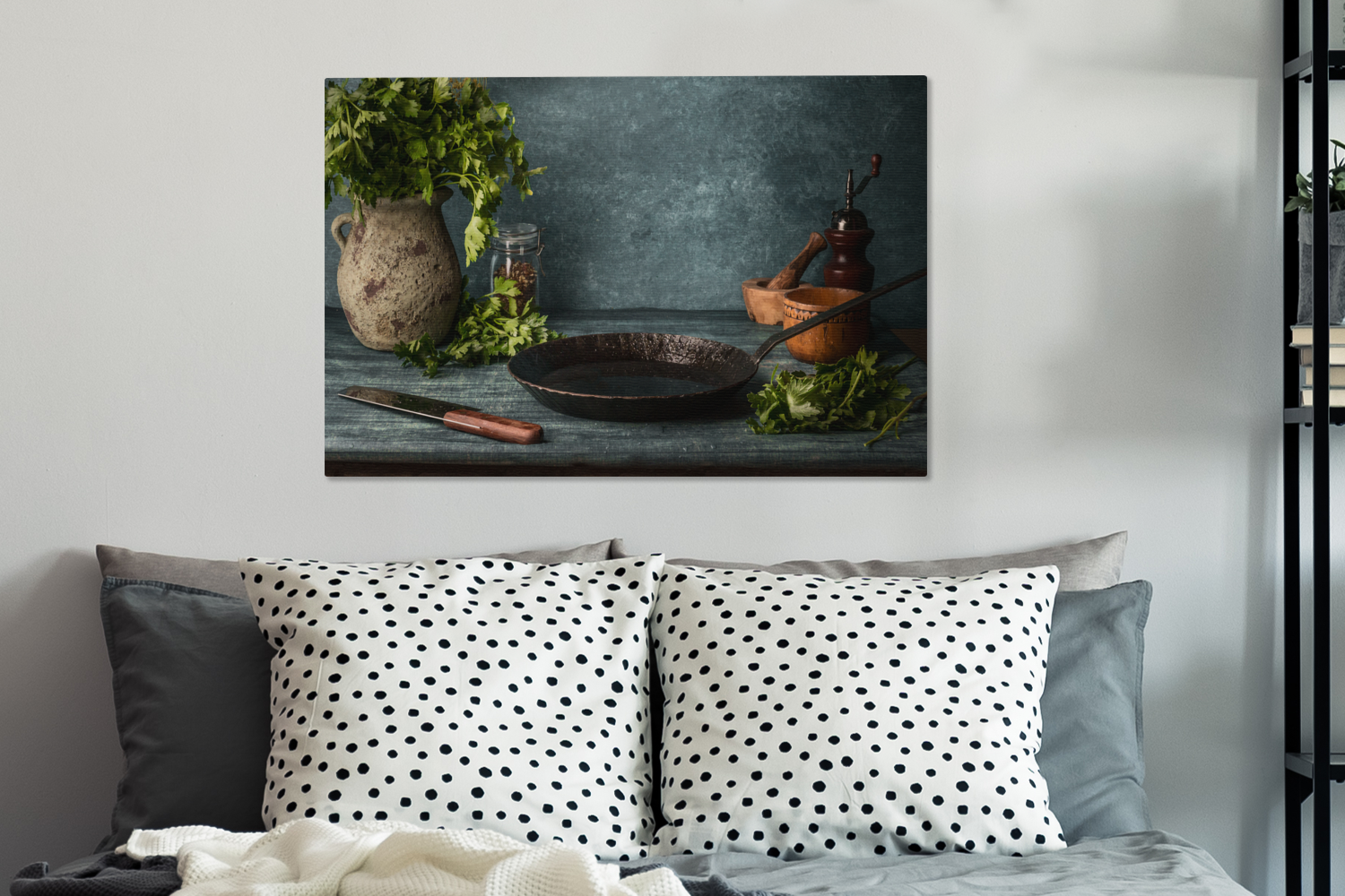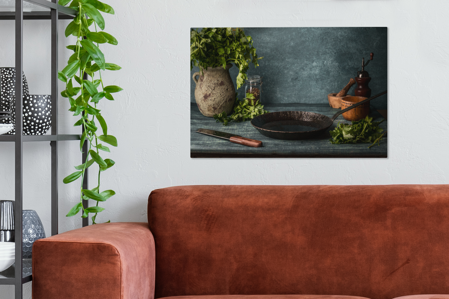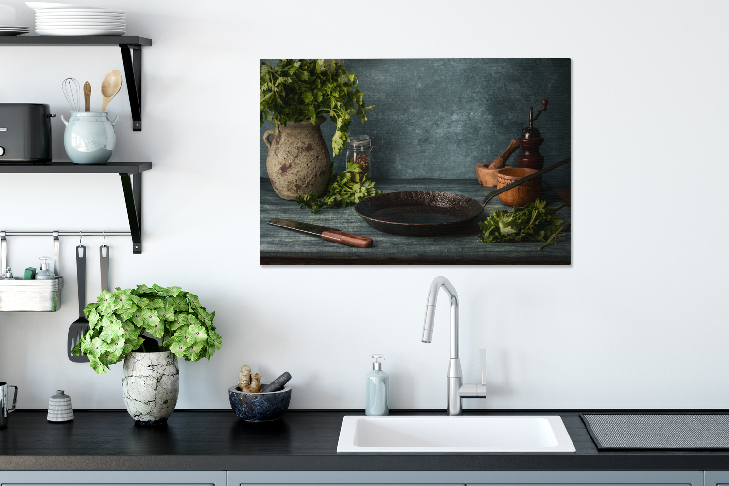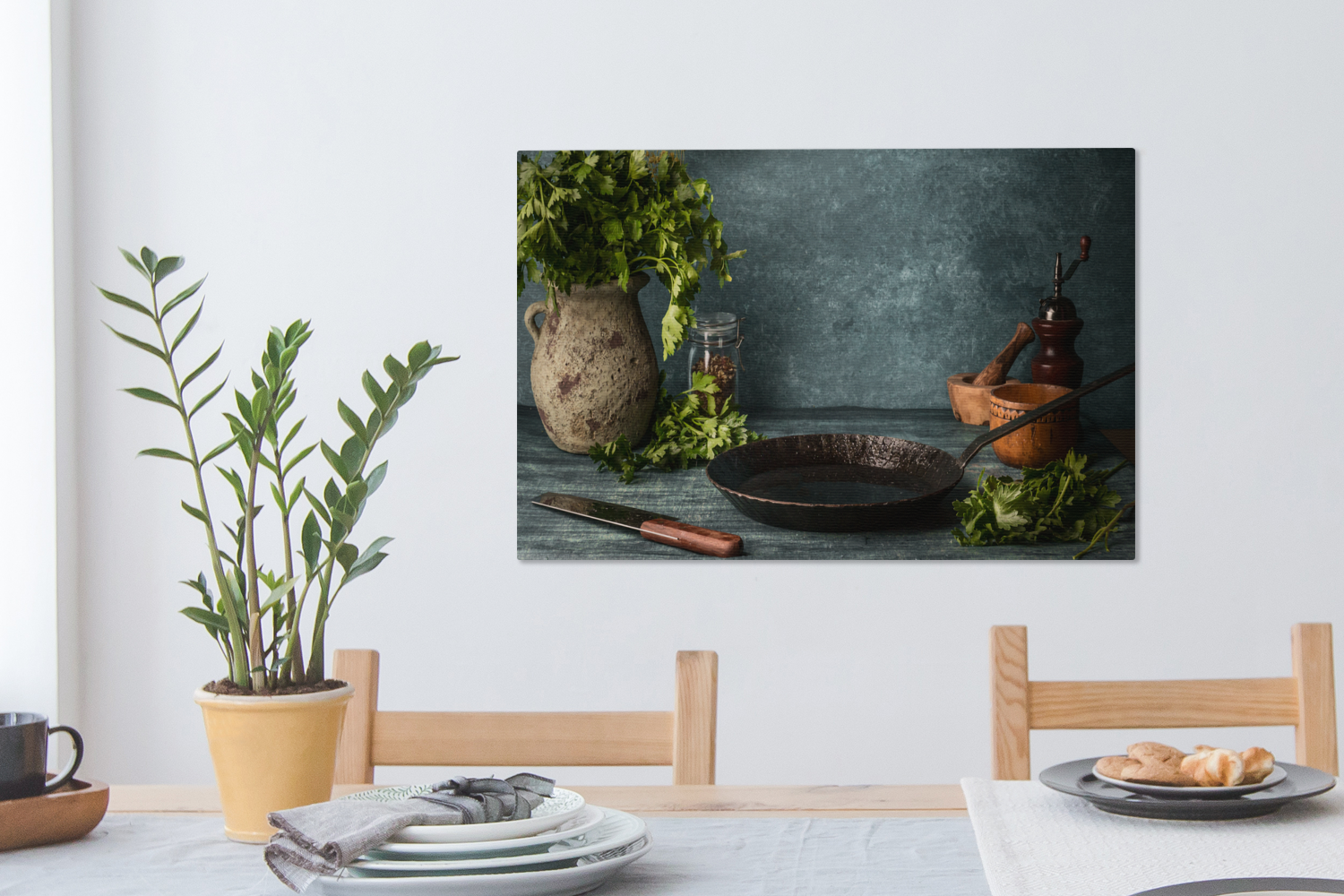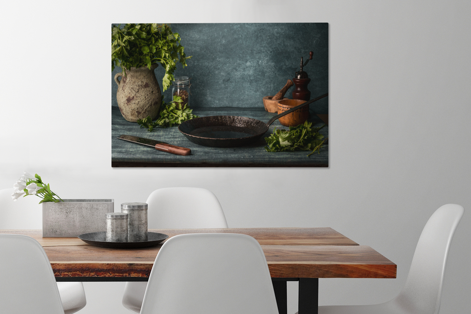 Passer le carrousel d'imagesUne table rustique dans la cuisine est décorée d'une casserole en fonte et de quelques autres objets essentiels dans la cuisine. Le vase est rempli d'herbes qui pendent mollement. Cette image convient parfaitement à la cuisine.