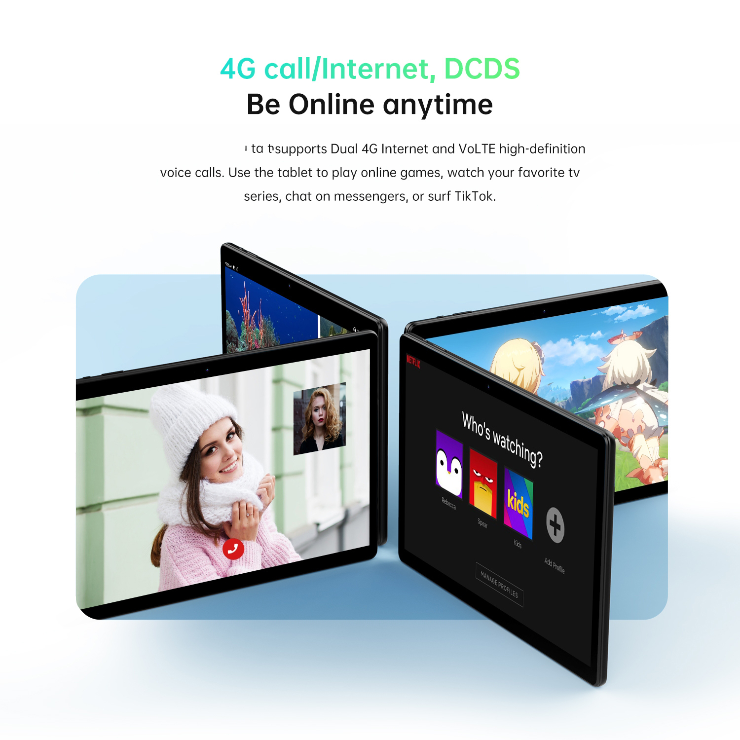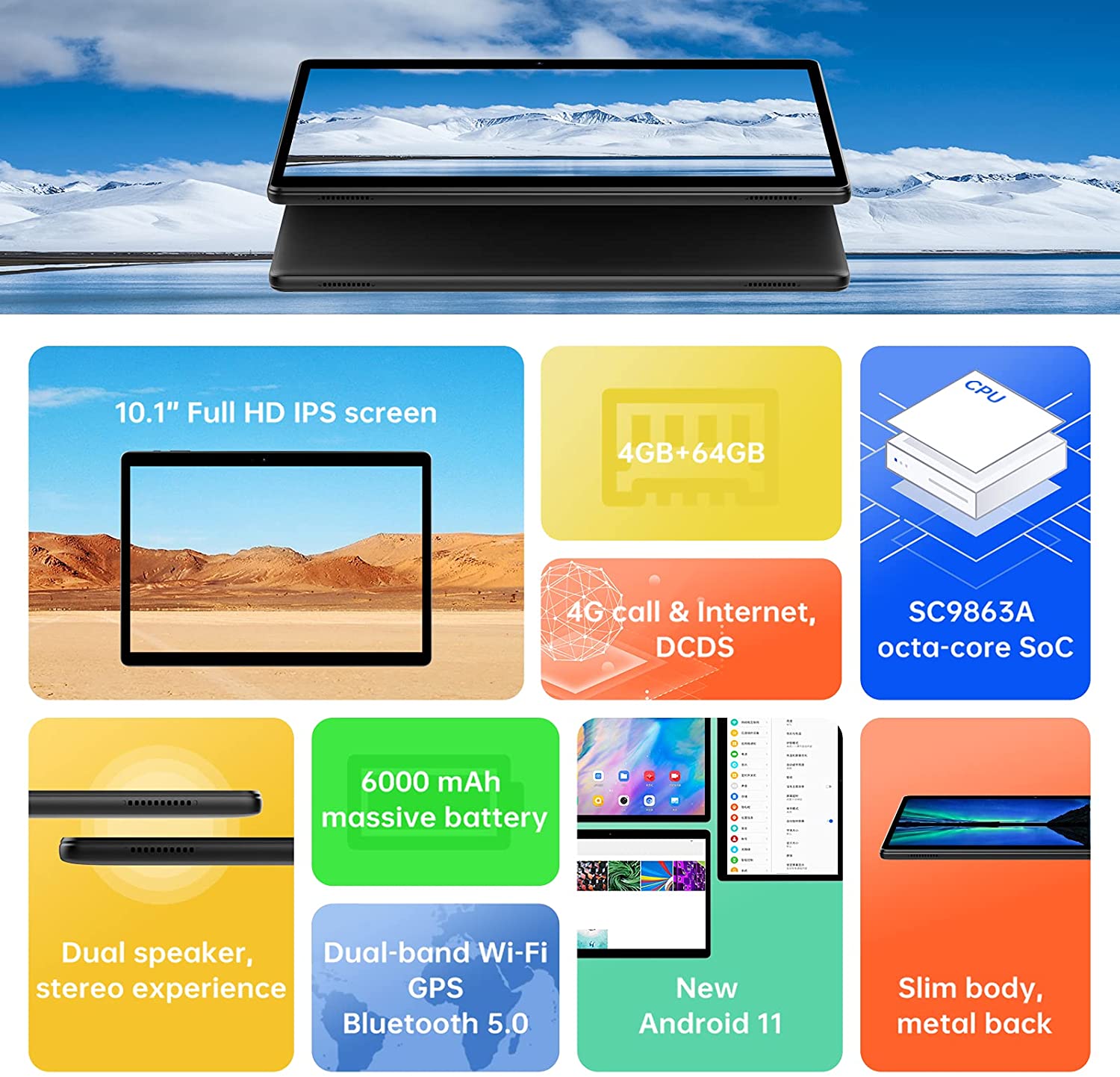 Cette tablette tactile Android est dotée d'une mémoire RAM de 4 Go, et d'une ROM de 64 Go, avec processeur Octa Core UNISOC Tiger SC9863A 8xA55, qui peut atteindre une vitesse de 1.6 GHz. Quant à sa batterie au lithium de 3,8 V/6000 mAh, elle se charge en 3 heures 40 minutes et offre à la tablette une autonomie en veille jusqu'à 30 jours. Cette batterie vous permet d'écouter de l'audio sans interruption sur l'appareil pendant 18 heures et de regarder en continu des vidéos pendant 6-7 heures.