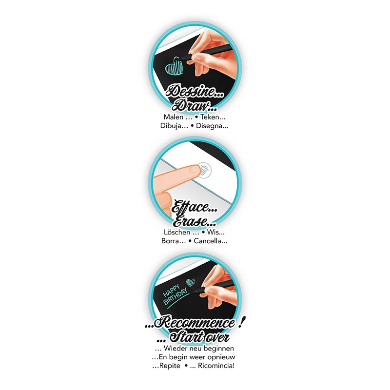 Ecris, dessine ou prends des notes sur la tablette à dessin avec écran LCD. Pour écrire, il suffit d'utiliser le stylet comme un stylo. Pour effacer, il suffit d'appuyer sur le bouton ! La tablette ne pèse que 100g et se transporte facilement.