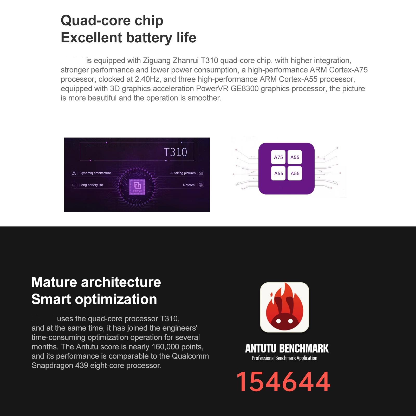 - CPU: Unisoc T310 Quad core (1 x A75 2.0G + 3 x A55 1.8GHz)