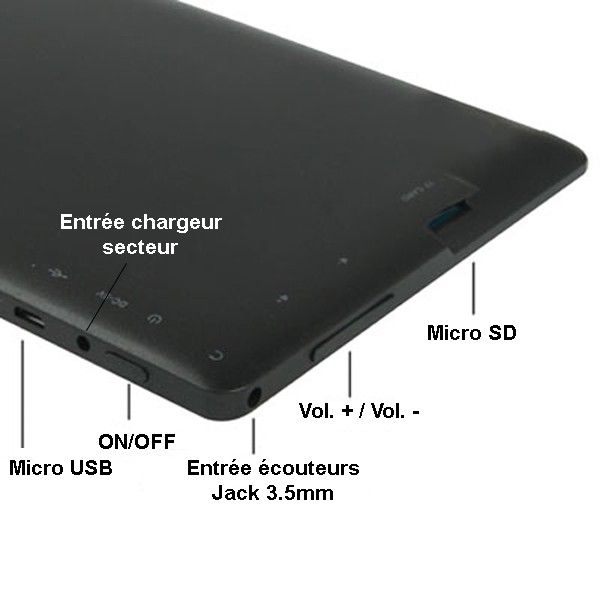 - Emplacement pour carte Micro SD (16Go fournie) allant jusqu'à 128 Go