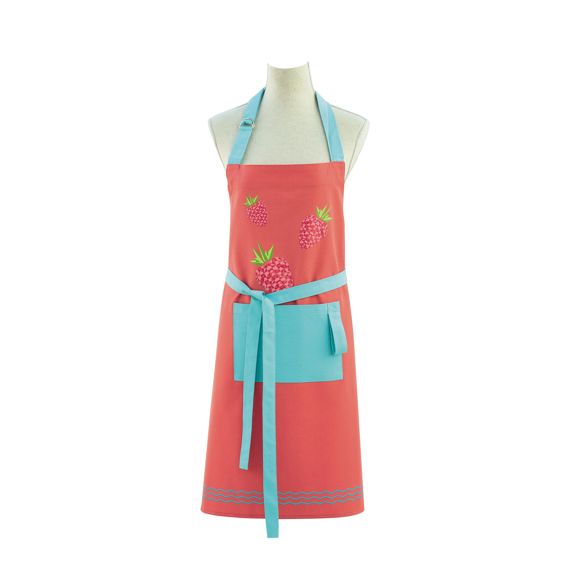 Dans des tons acidulés de turquoise et de corail, ce tablier sérigraphié est imprimé de trois fraises.