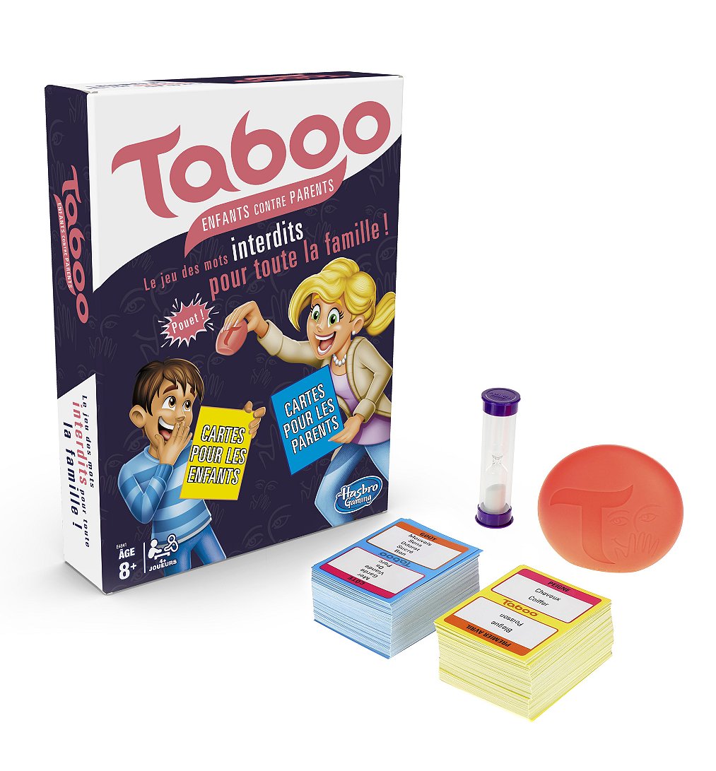 | Plus produit | Taboo Enfants contre Parents : jeu de société où le but du jeu est de faire deviner le maximum de mots pour marquer le plus de points possible. Dans ce nouveau Taboo, découvrez des cartes pour enfants et des cartes pour adultes afin de jouer ensemble ou de s\'affronter en famille ! Version française. Principe du jeu : essayez de faire deviner un maximum de mots à votre équipe en donnant des mots qui ne sont pas dans la liste des mots interdits avant la fin du sablier. Mais attention, si vous prononcez un mot interdit indiqué sur la carte (seulement 2 sur les cartes enfants), les adversaires marquent le point. L équipe qui remporte le plus de points gagne la partie. A partir de 4 joueurs. Temps de la partie : 20 minutes et plus. Âge recommandé : à partir de 8 ans. Accessoires inclus : 260 cartes (130 pour enfants et 130 pour adultes) incluant plus de 1000 mots à faire deviner, un sablier, un couineur, un bloc-notes et les règles du jeu en français. Aucune pile n\'est nécessaire. Vous aimez les jeux de société et partager un moment en famille ou entre amis ? Taboo Enfants contre Parents est le jeu parfait à offrir en cadeau pour les enfants, filles et garçons de 8 ans, 9 ans, 10 ans et plus. Valeur éducative : apprendre, partager, s\'amuser. |