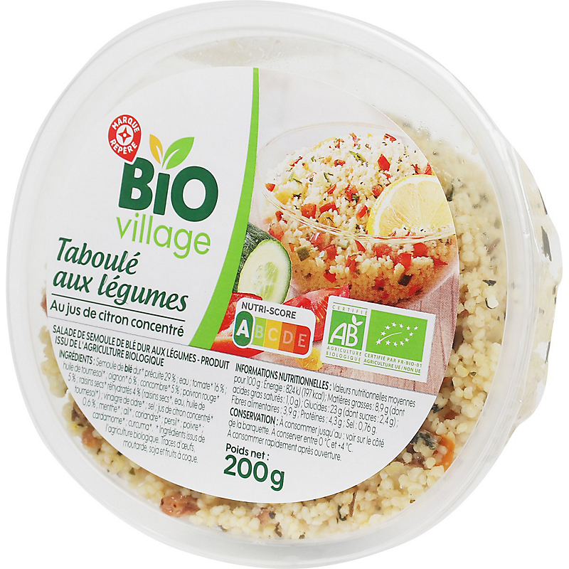 Ingrédients : Semoule de blé dur* précuite 25,5 % ; eau ; tomate* 12,7 % ; poivron rouge * 7,8 % ; huile de tournesol* ; oignon* 5,9 % ; concombre* 4,9 % ; raisin sec* réhydraté 4,9 % (raisin sec*, eau, huile de tournesol*) ; huile d'olive* ; vinaigre d'alcool* ; jus de citron concentré* 0,9 % ; sel ; menthe* ; coriandre* ; persil* ; poivre* ; curcuma*.