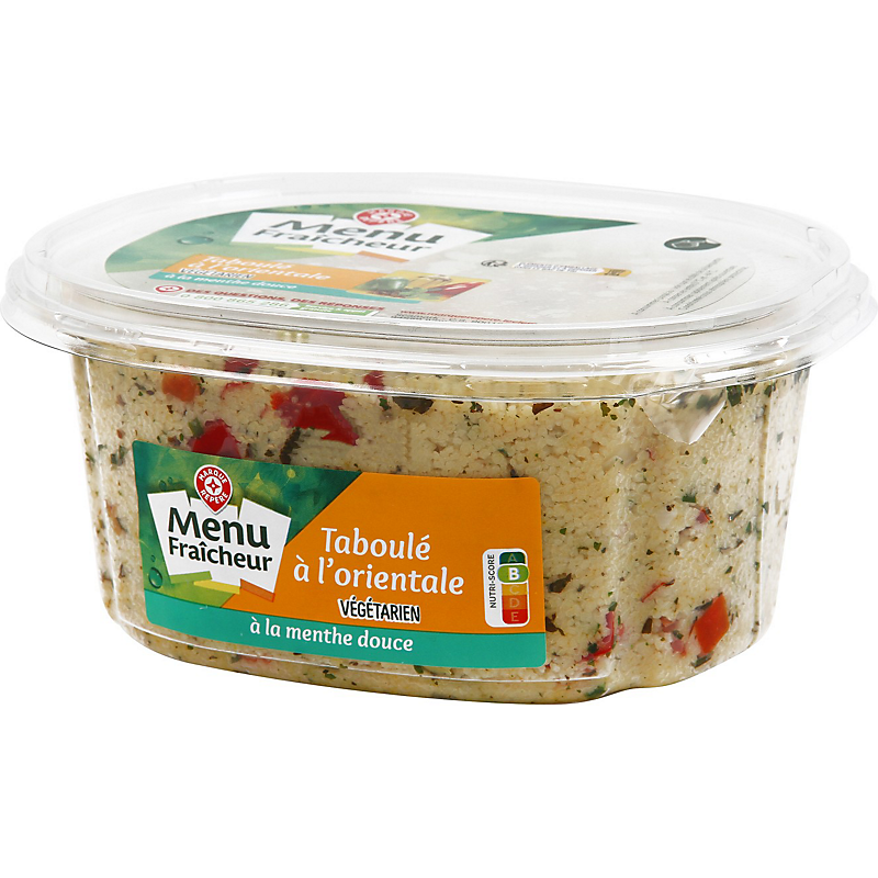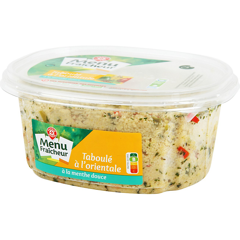 Ingrédients : eau ; semoule de blé dur 29 % ; poivrons 12 % ; raisins secs réhydratés 5,2 % (raisins secs, eau) ; jus de citron à base de concentré ; tomates 4,1 % ; oignons 4,1 % ; huile de colza 3,1 %, ; huile d'olive vierge extra ; menthe douce 1,3 % ; vinaigre d'alcool ; sel ; persil ; ciboulette ; ail ; arôme naturel de poivre ; conservateur : E202 ; curcuma.