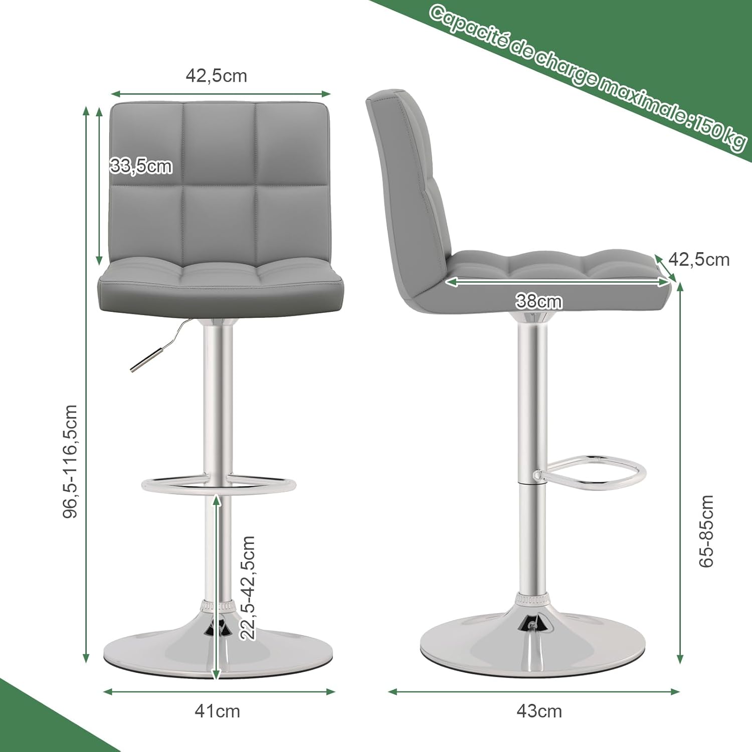 - FABRICATION ROBUSTE La chaise de bar pivotante est conçue avec un vérin à gaz de qualité et une grande base en métal, supportant facilement jusqu'à 150 kg. De plus, la surface chromée prolonge sa durée de vie et donne un aspect élégant.