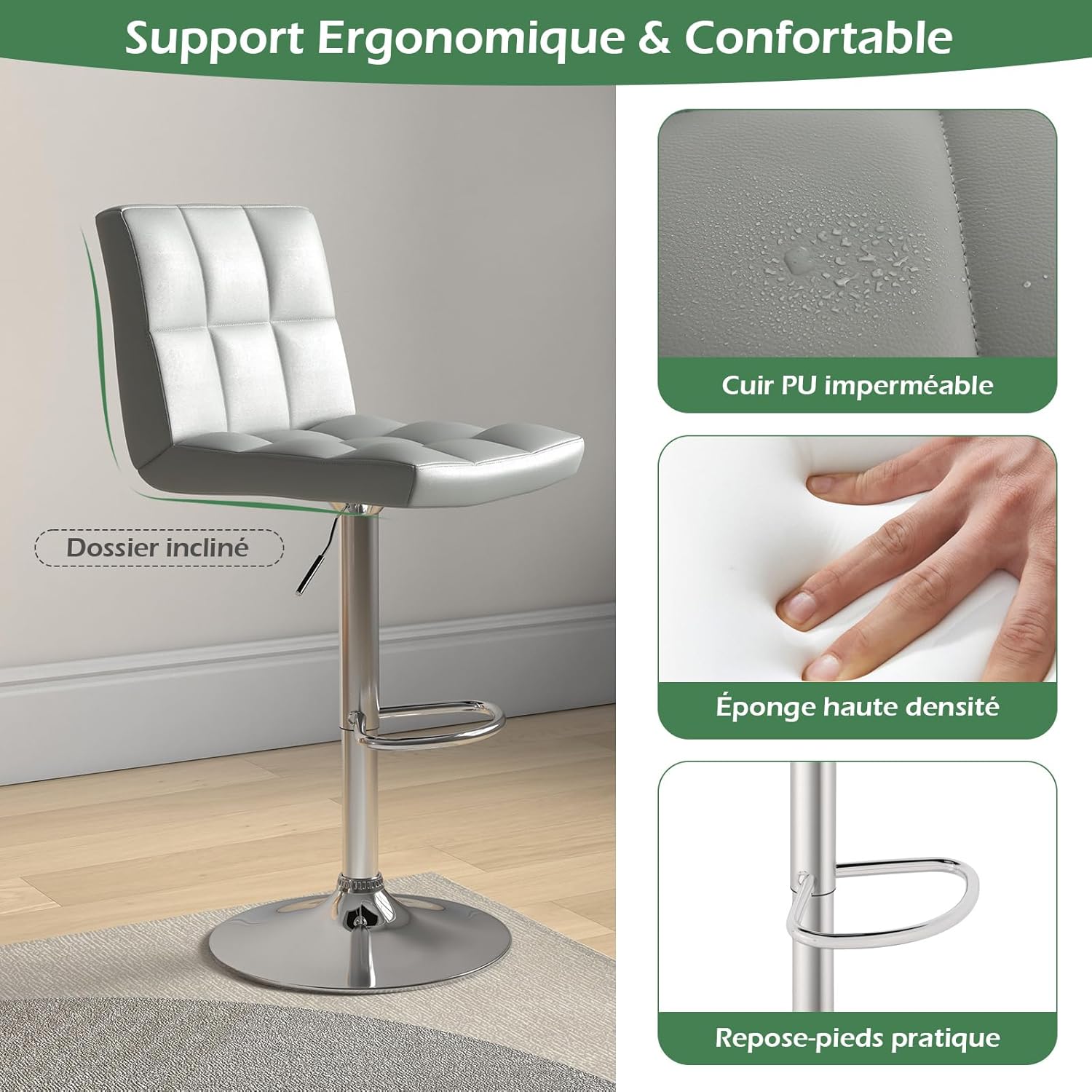 - ASSISE CONFORTABLE Rempli d'éponge haute densité, le tabouret haut offre une expérience d'assise confortable avec un soutien optimal. De plus, le PUest non seulement doux au toucher, mais également imperméable pour un entretien facile.