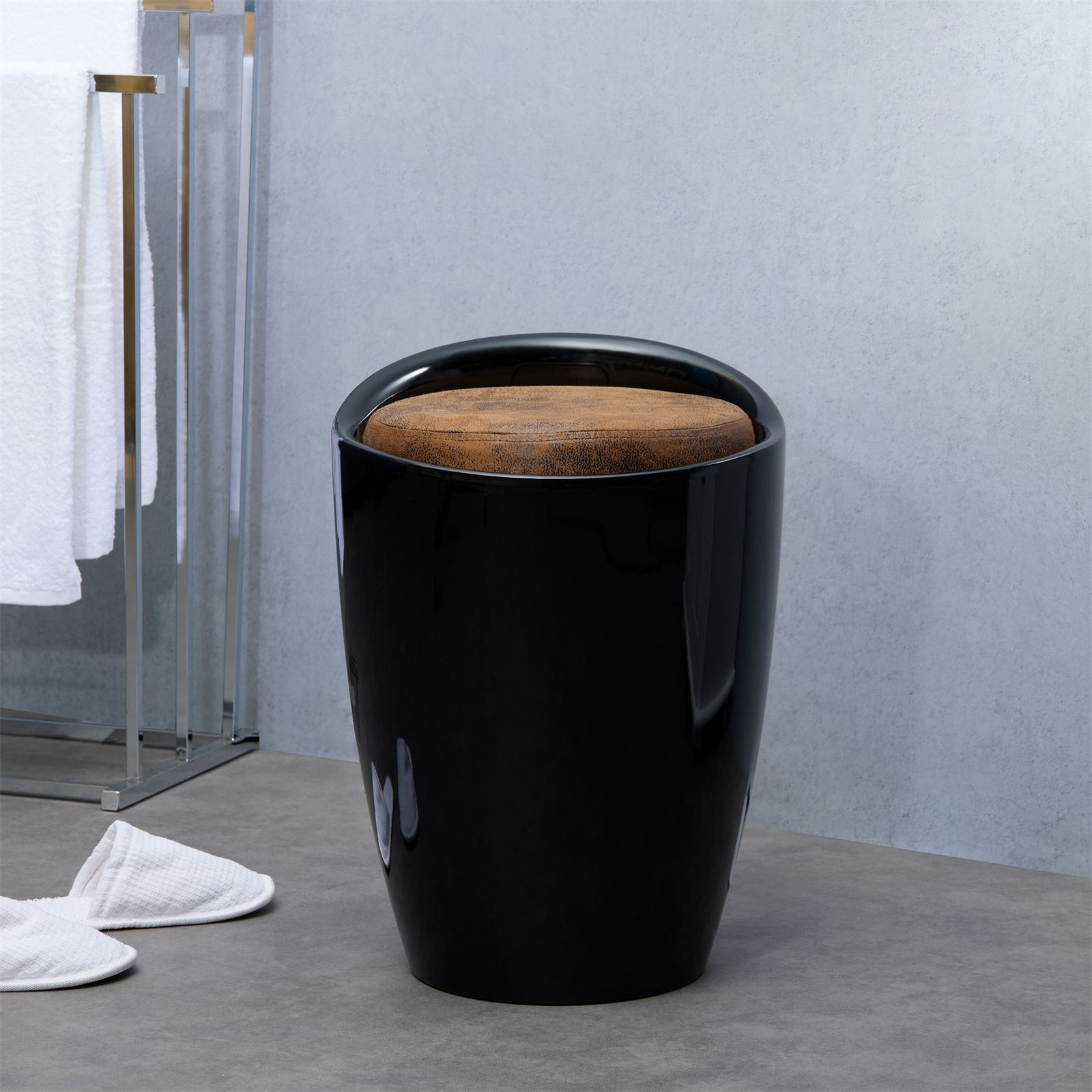 Tabouret DANIEL pouf rond avec rangement et assise rembourrée, structure en plastique noir et revêtement