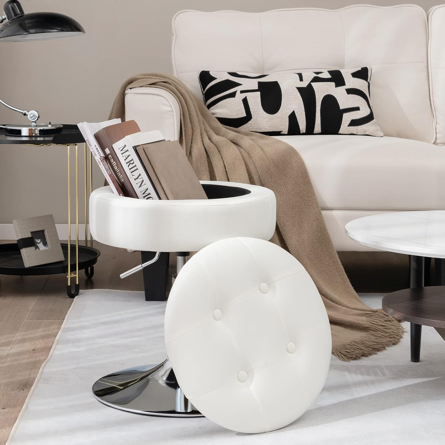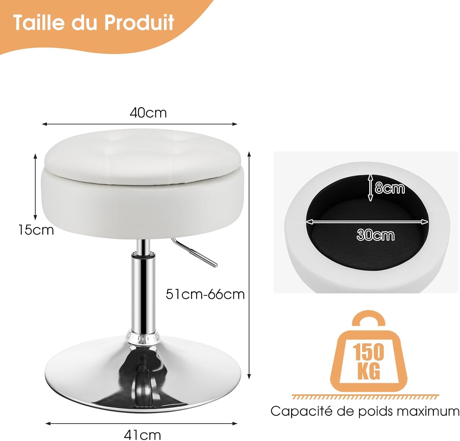 Grâce à la base en acier renforcé, équipée de l'anneau en caoutchouc antidérapant, le tabouret de coiffeuse peut supporter un poids élevé jusqu'à 150 kg. De plus, l'intérieur en éponge et le cuir extérieur en plastique PU assurent un toucher doux et une bonne respirabilité pour le confort. Si vous êtes gêné par un espace limité, cela peut vous aider beaucoup. En retirant le couvercle supérieur, vous pouvez trouver un rangement caché, où vous pouvez placer des articles divers.