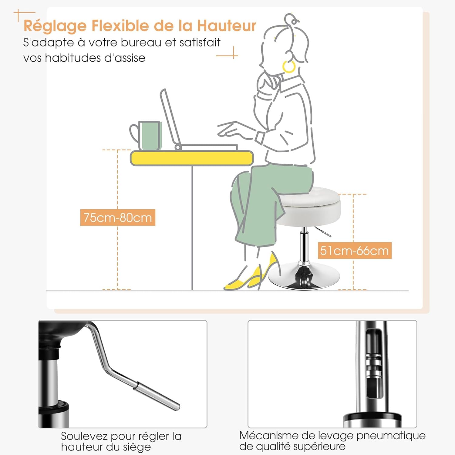- Hauteur réglable pour plus de flexibilité : La hauteur totale du tabouret de coiffeuse peut être personnalisée entre 51 cm et 66 cm pour répondre à plus de besoins. Une position basse est confortable pour vous dégourdir les jambes et une position spécifique basée sur votre taille est parfaite pour vous reposer, vous maquiller ou travailler. Pour rappel, une coiffeuse de 75-80cm de hauteur conviendrait.