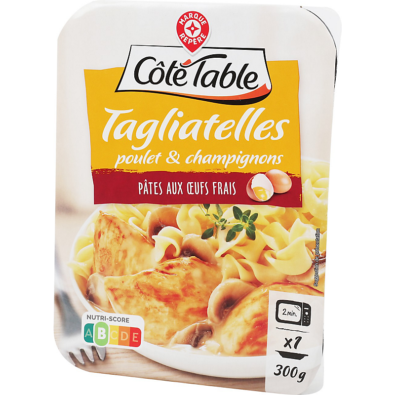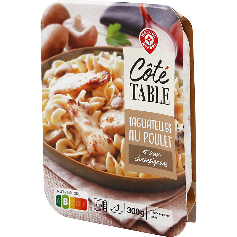 Ingrédients: Pâtes alimentaires cuites aux œufs 42,4 % (eau, semoule de blé dur, oeuf 5,8 %) ; morceaux de viande de poulet reconstituée traitée en salaison rôtie cuite 16,6 % (viande de poulet, dextrose, sel) ; eau ; crème fraîche 12 % ; champignons de Paris 8 % ; huile de colza ; vin blanc ; amidon de riz ; fond de volaille aromatisé (dextrose, sel, arôme naturel de poulet, graisse de poulet, épices) ; échalotes 1 %; sel ; cèpes déshydratés 0,1 % ; sirop de sucre caramélisé ; persil déshydraté ; poivre.