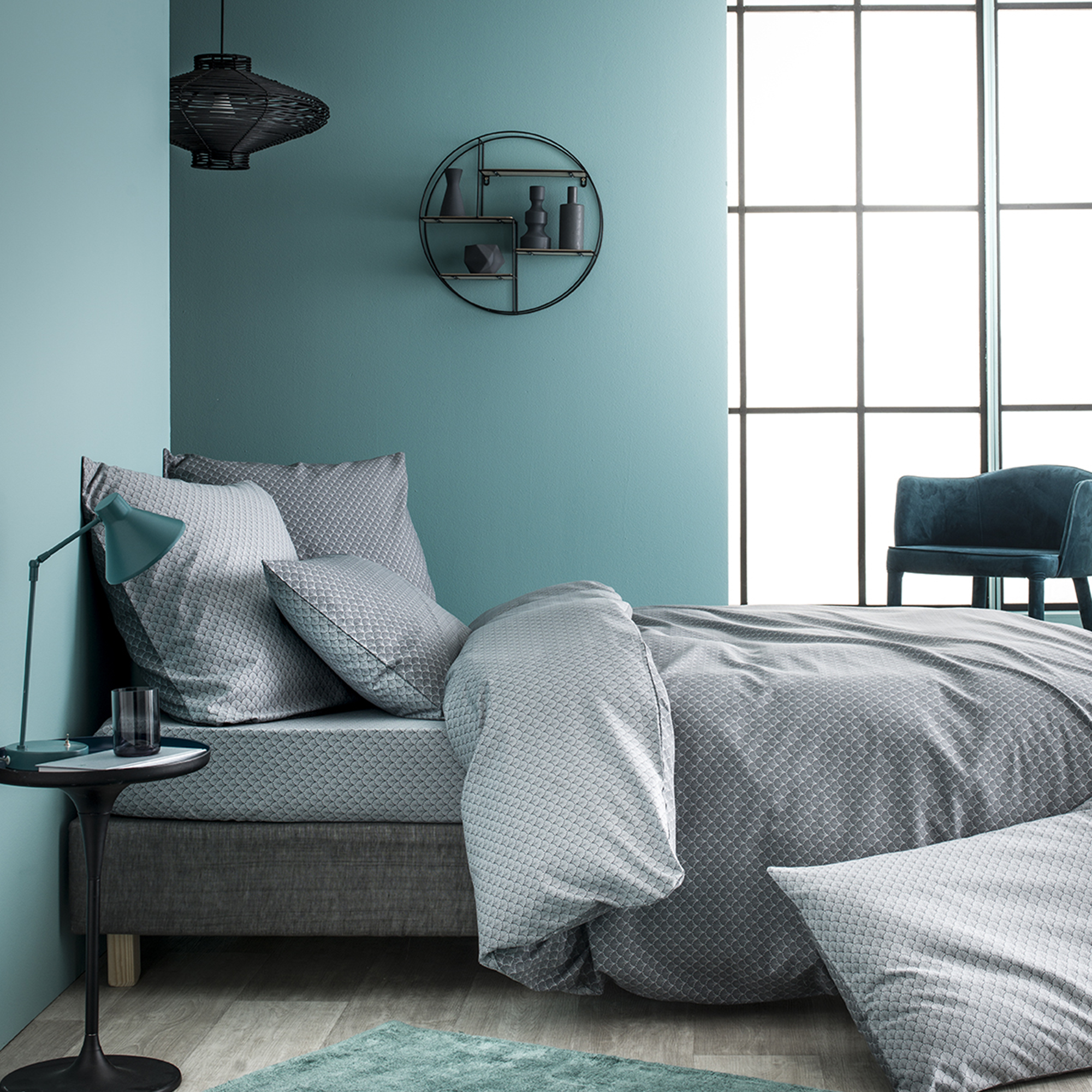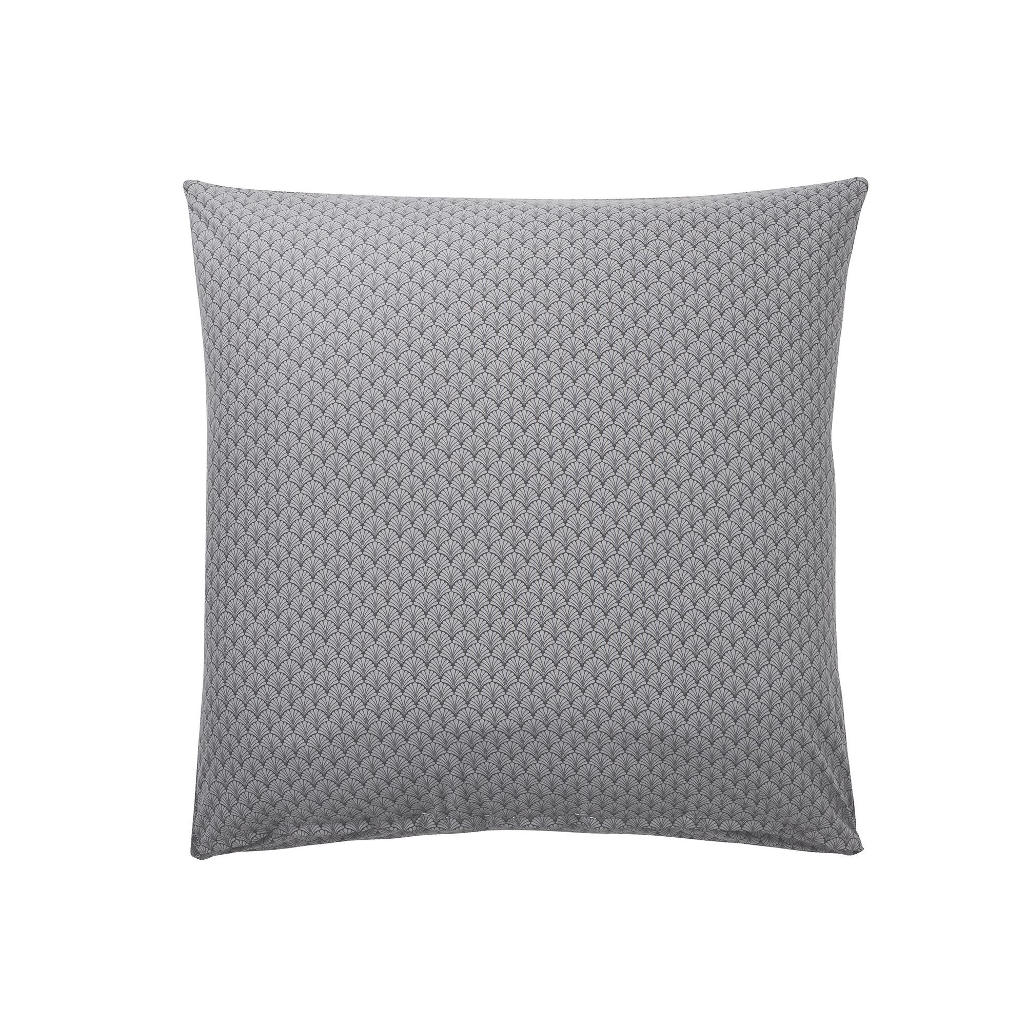 La taie d'oreiller réversible est imprimée du motif "écailles" sur ses deux faces, le recto étant plus foncé que le verso.