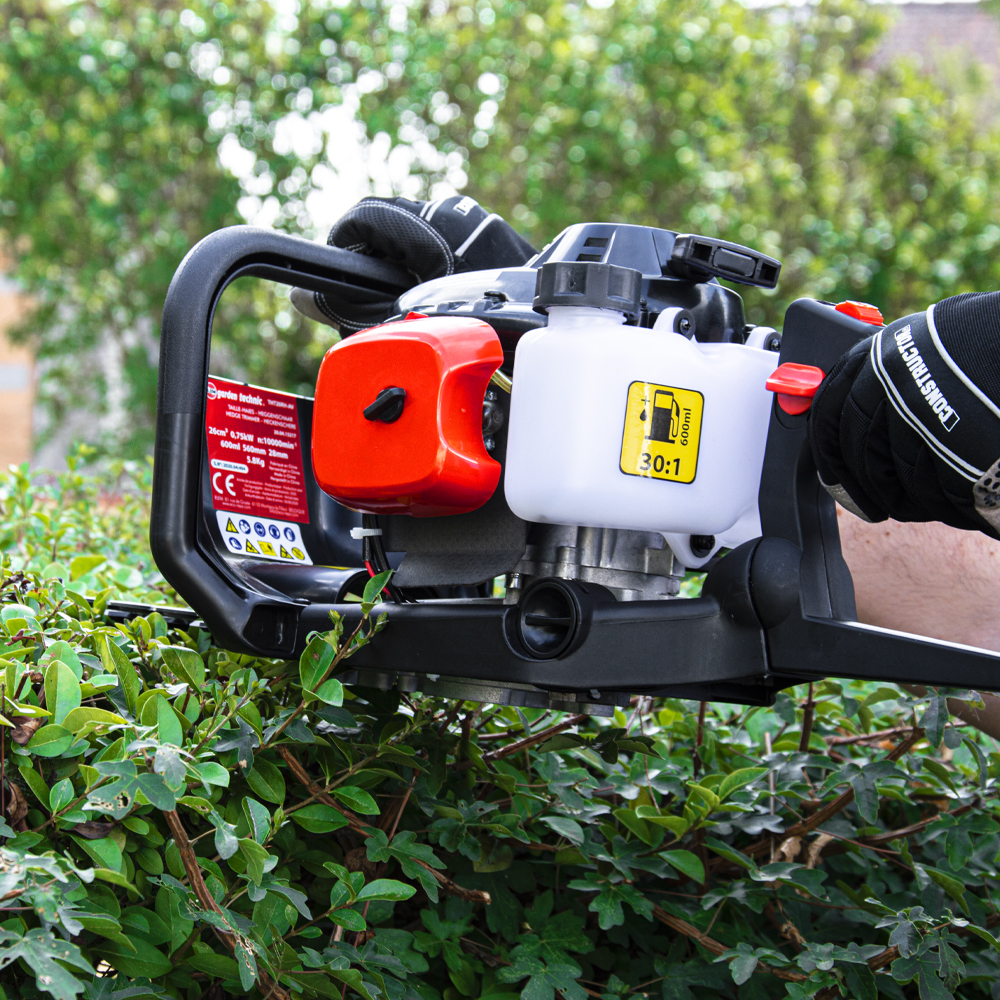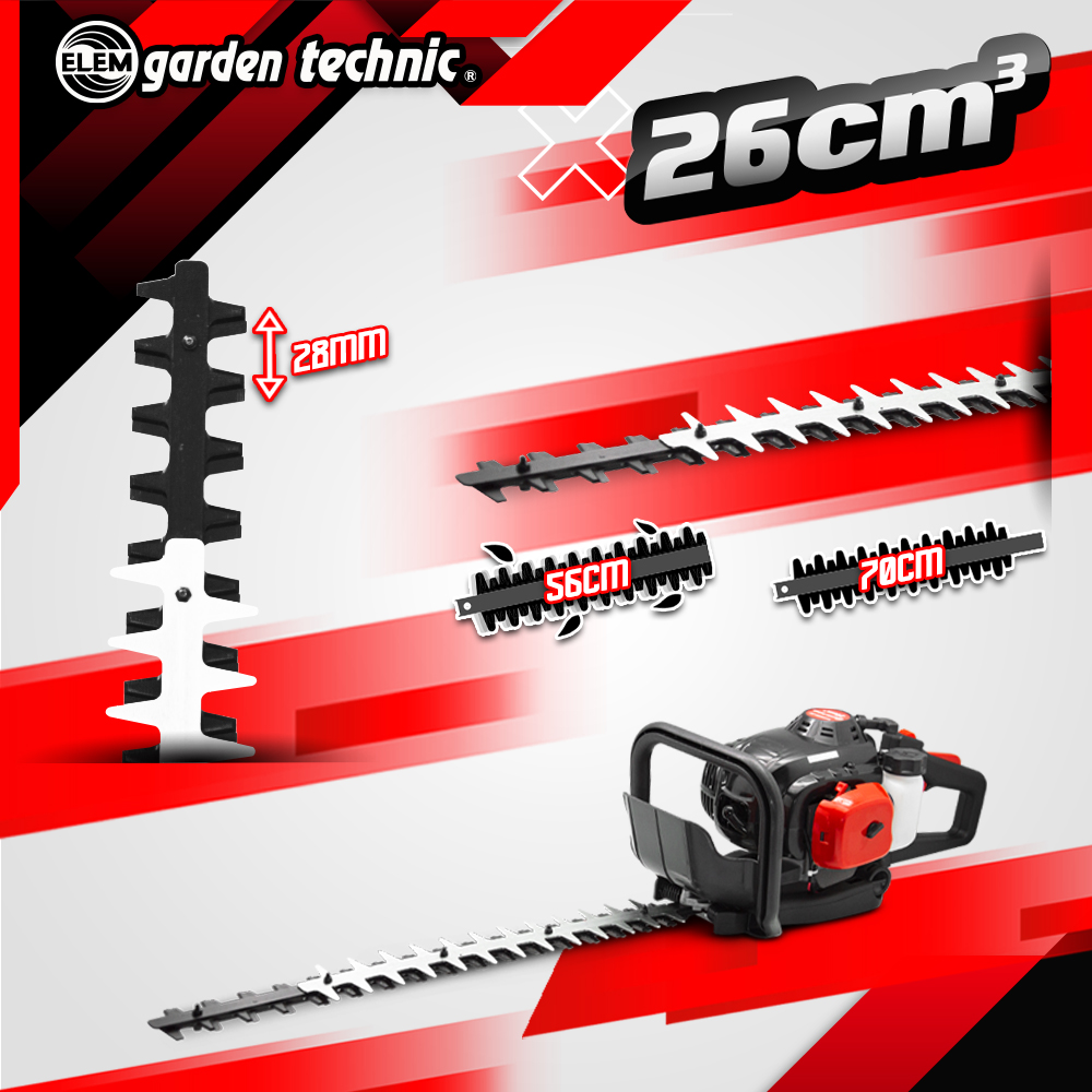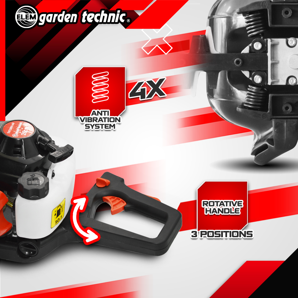 Taille haies thermique 26cc avec une longueur de coupe de 56cm et une capacité de coupe de 28mm Protection de lame en aluminium Poignée arrière rotative 3 positions pour faciliter la taille des côtés et du dessus des haies. Système antivibrations
