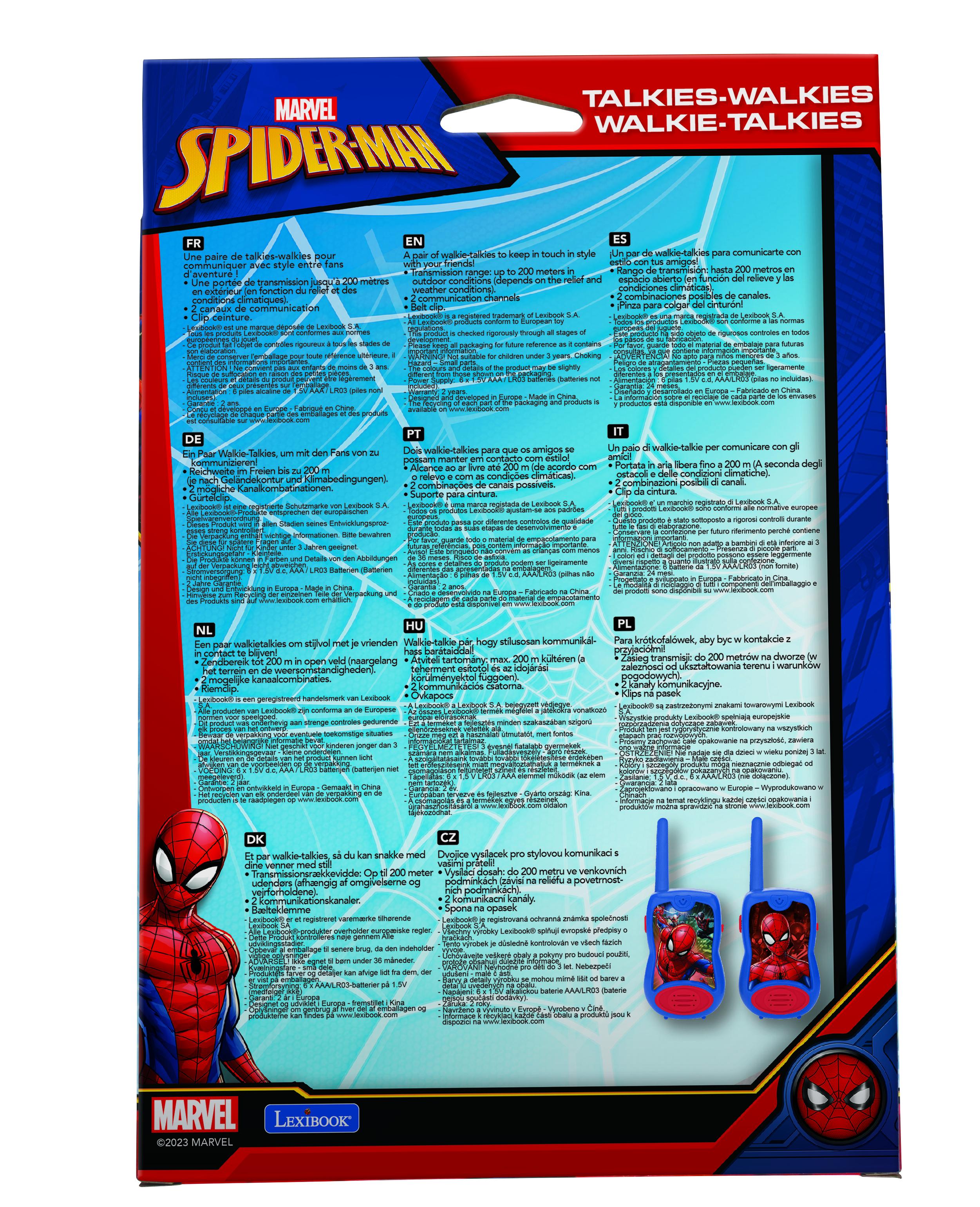 * Une paire de talkies-walkies pour garder le contact en toute �l�gance avec vos amis ! * Port�e de transmission : jusqu'� 200 m�tres en ext�rieur (d�pend du relief et des conditions m�t�orologiques). * Une belle image de Spiderman. * Antenne dure et 2 canaux de communication. * Clip de ceinture.