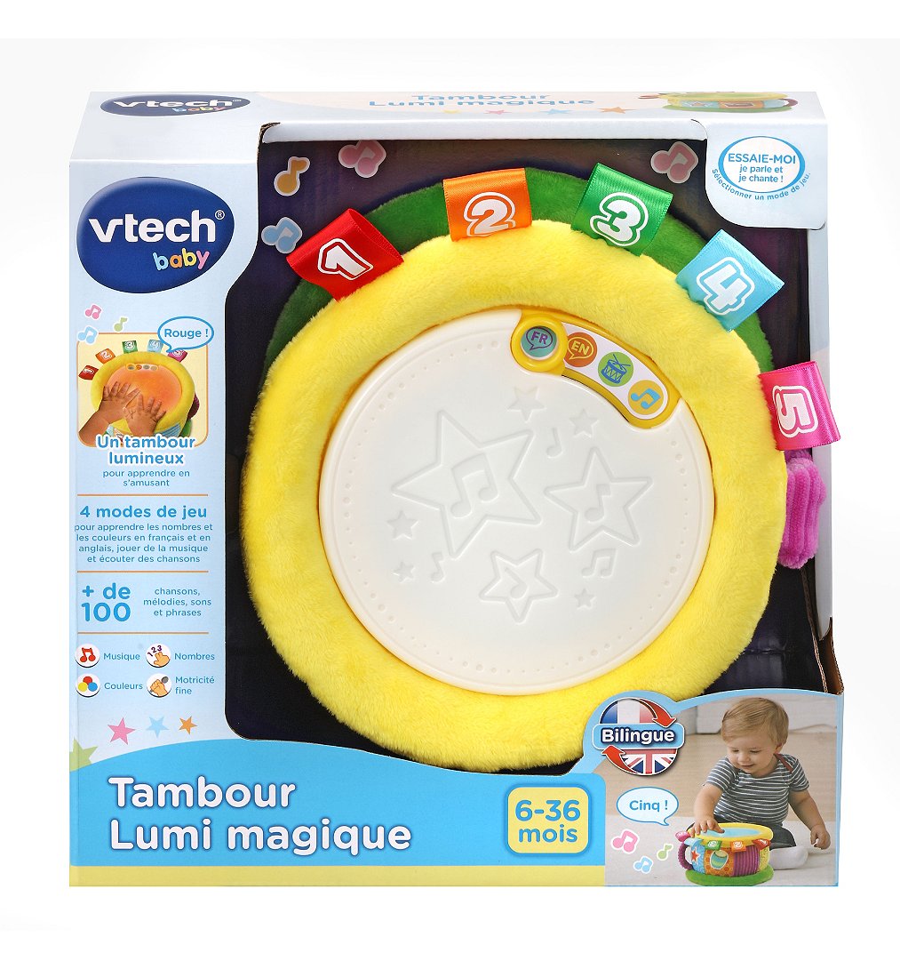 Tambour Lumi Magique - 6 - 36 mois Magique ! Quand bébé tape sur le tambour il déclenche des sons et des variations de lumières 4 modes de jeu : Mode couleurs et nombres en français : bébé mélange les couleurs en tapant sur le tambour au rythme de jolies mélodies. Une couleur apparaît à chaque battement. Mode couleurs et nombres en anglais : bébé découvre les couleurs et apprends les nombres en anglais. Mode chansons : Bébé joue du tambour au rythme de chansons et mélodies. Mode tambour : Bébé réalise ses plus belles compositions avec son tambour ! 100% bilingue français / anglais Poignée pour le transporter facilement Plus de 100 chansons, mélodies, sons et phrases Arrêt automatique. Réglage du volume sonore. Boîte ouverte. Fonctionne avec 2 piles LR6/AA
