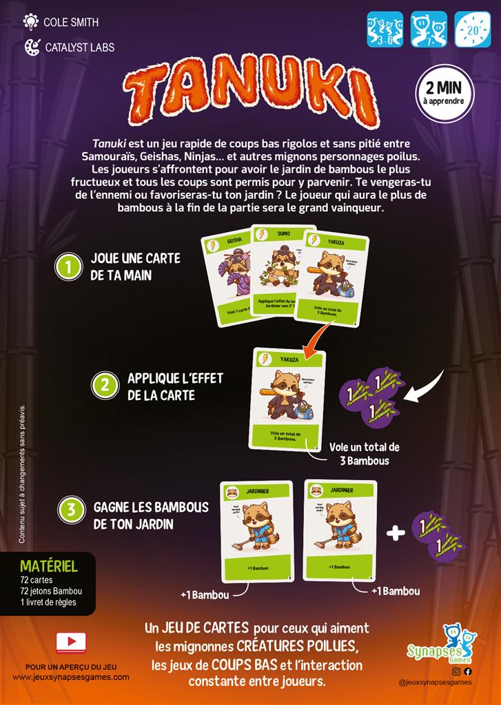 Tanuki est un jeu rapide de Samouraïs, Geishas, Ninjas.. et beaucoup de mignonnes choses à fourrure. Les joueurs s'affrontent pour avoir le jardin de bambous le plus productif et posséder le plus de bambous à la fin de la partie !