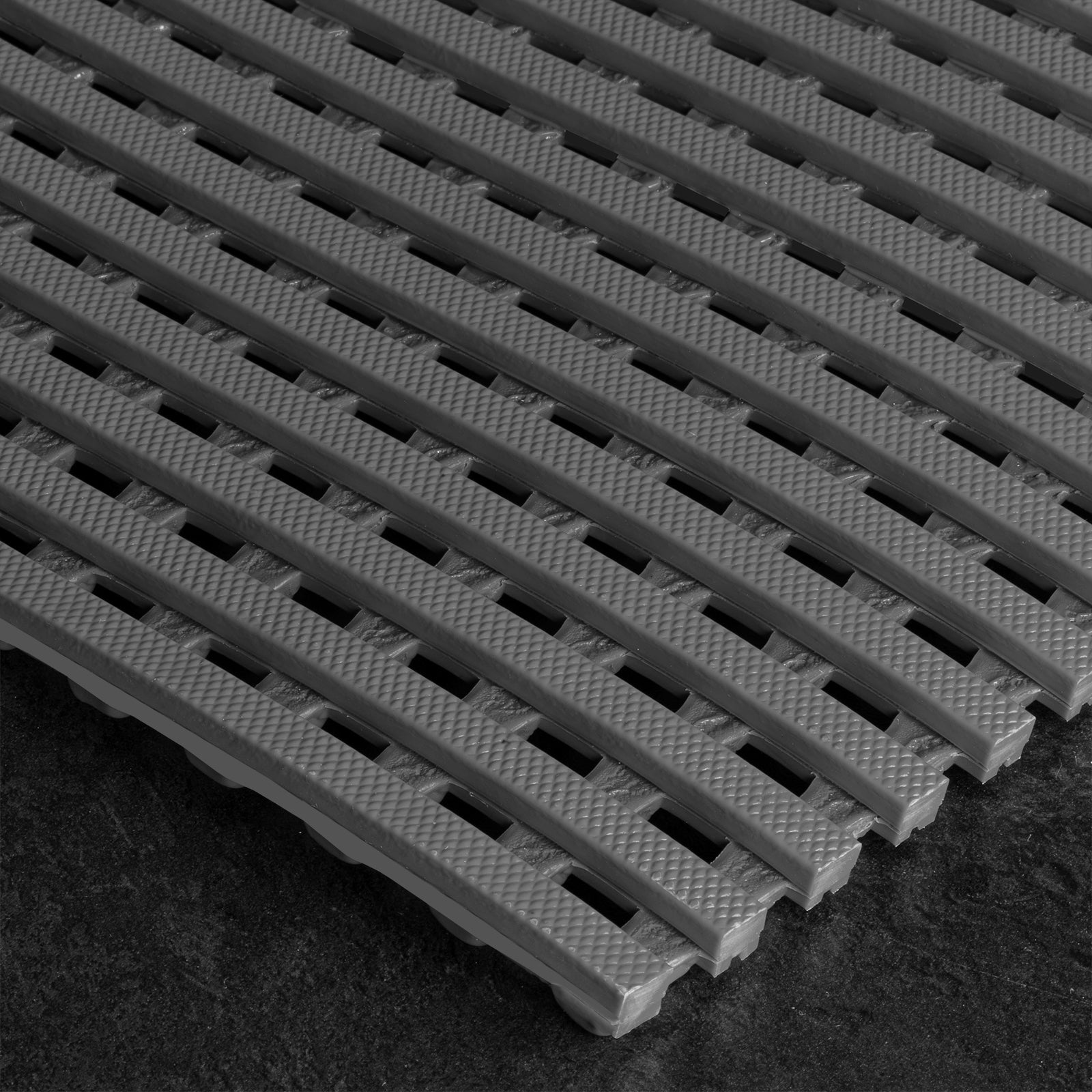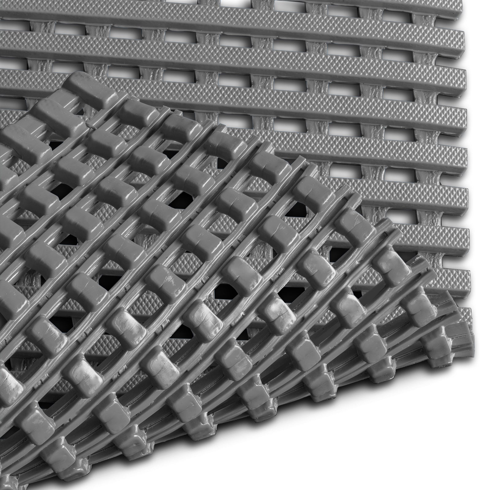 Le tapis antidérapant sur mesure « Adria » répond parfaitement à ces exigences. Sa surface composée de bandes élastiques en PVC offre, en plus d'une excellente adhérence, de bonnes propriétés d'amortissement des mouvements, soulageant ainsi le corps lors du travail. La surface en maillage présente un autre avantage : elle garantit un drainage optimal, permettant aux liquides de s'écouler rapidement et efficacement à travers la grille de sol. La grille en plastique se distingue par sa polyvalence et sa robustesse. Le tapis antidérapant est non seulement résistant aux produits chimiques et aux huiles, mais aussi difficilement inflammable et doté de propriétés antibactériennes.