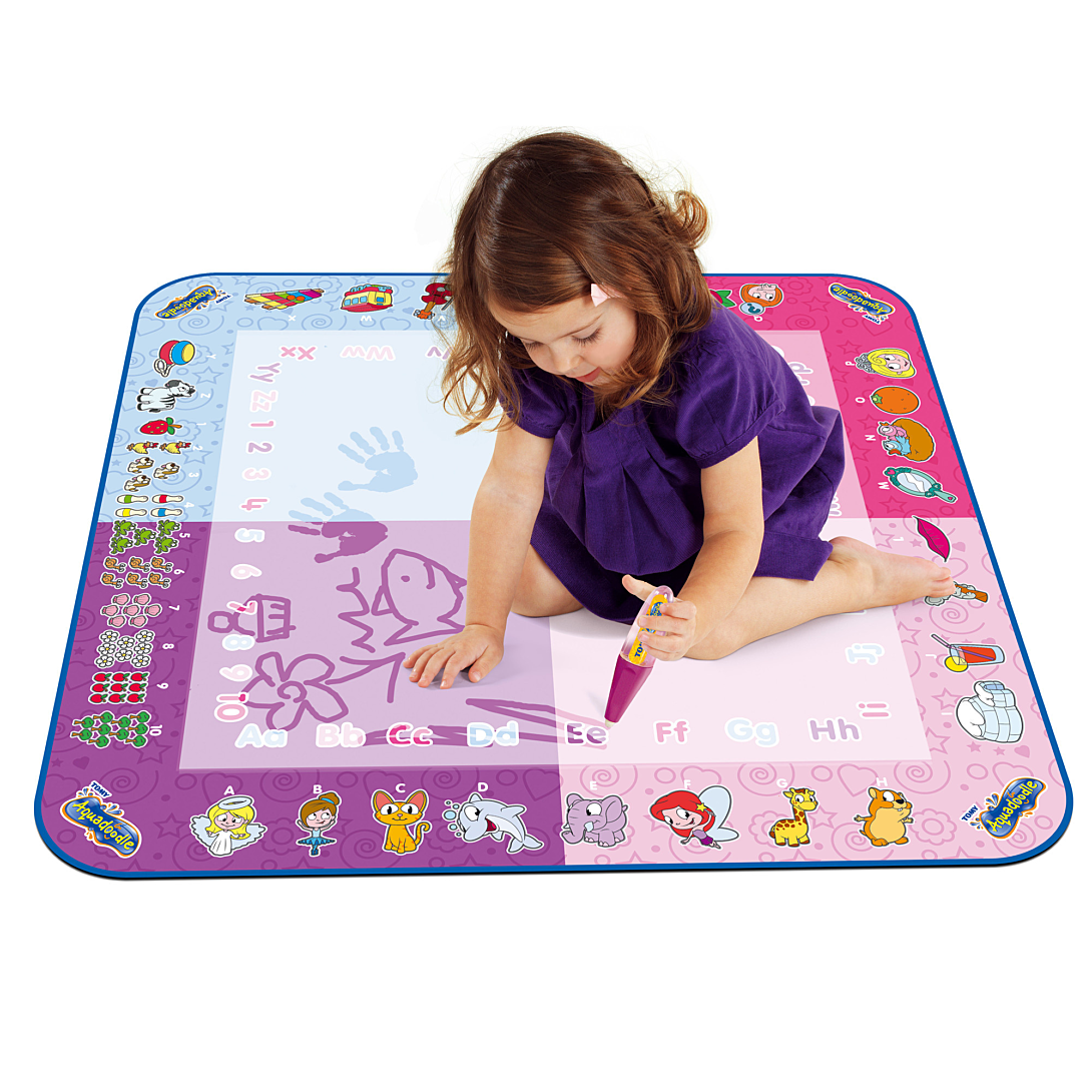 Un tapis ludique vraiment magique pour dessiner à l’eau tout en couleur et sans se tacher ! La surface de dessin est découpée en 4 couleurs, le stylo fonctionne à l’eau pour éviter tout risque de taches ! Educatif : L’enfant apprends à écrire les chiffres et les lettres tout en couleur. Il découvre aussi de nouveaux mots grâce aux images correspondant à chaque lettre et chiffre. Un plaisir infini : au bout de quelques minutes, l’eau s’évapore et le dessin disparaît. L’enfant peut recommencer à l’infini! Des heures de dessin en perspective et une super alternative aux feuilles de papier ! Dimensions du tapis 75 cm x 75 cm. Dès 18 mois.