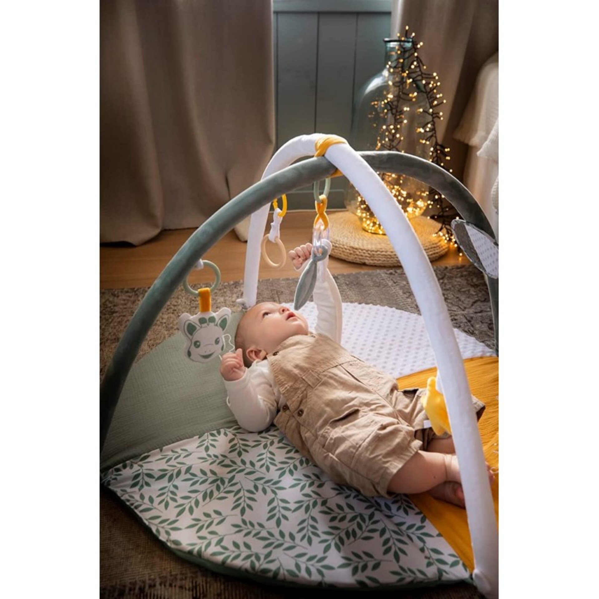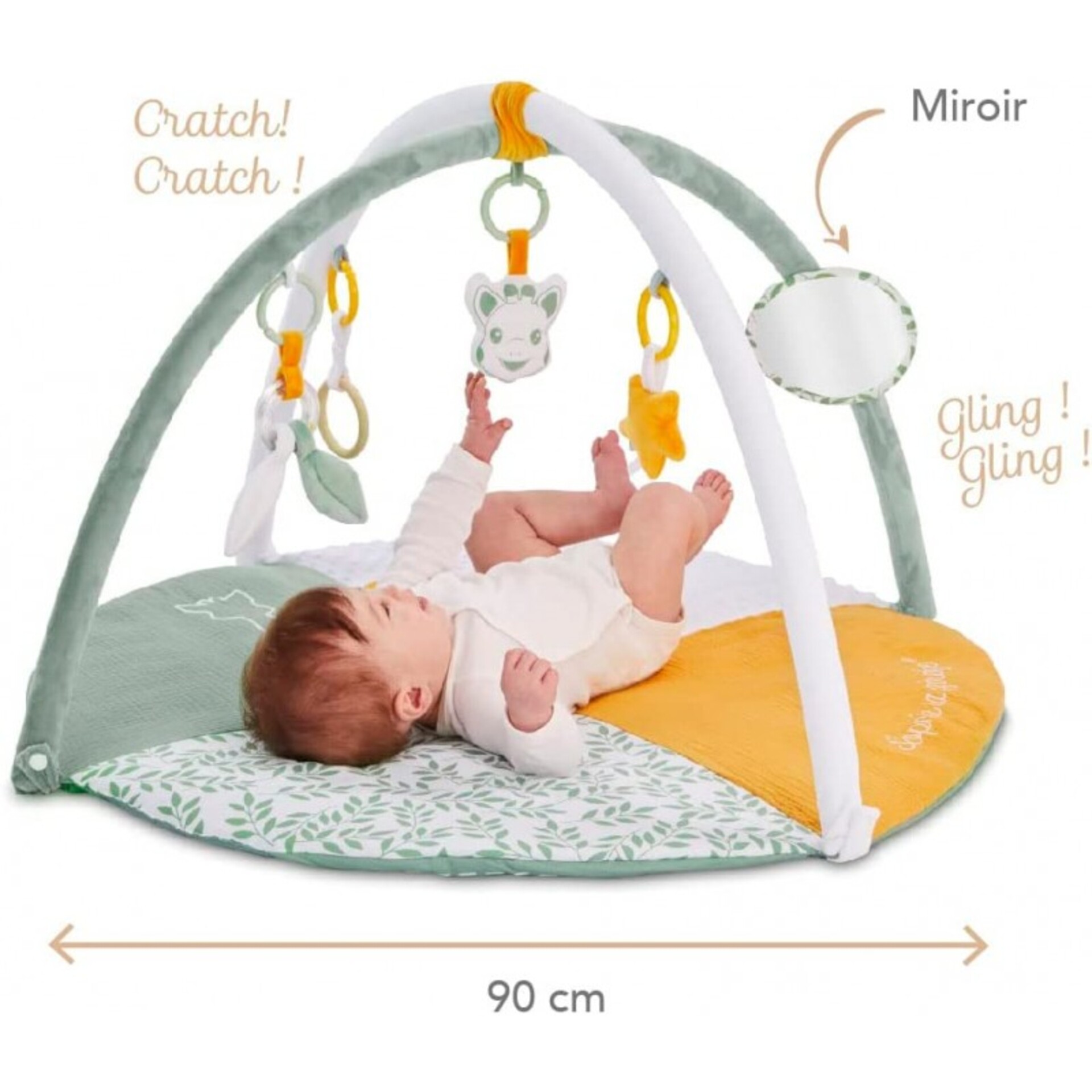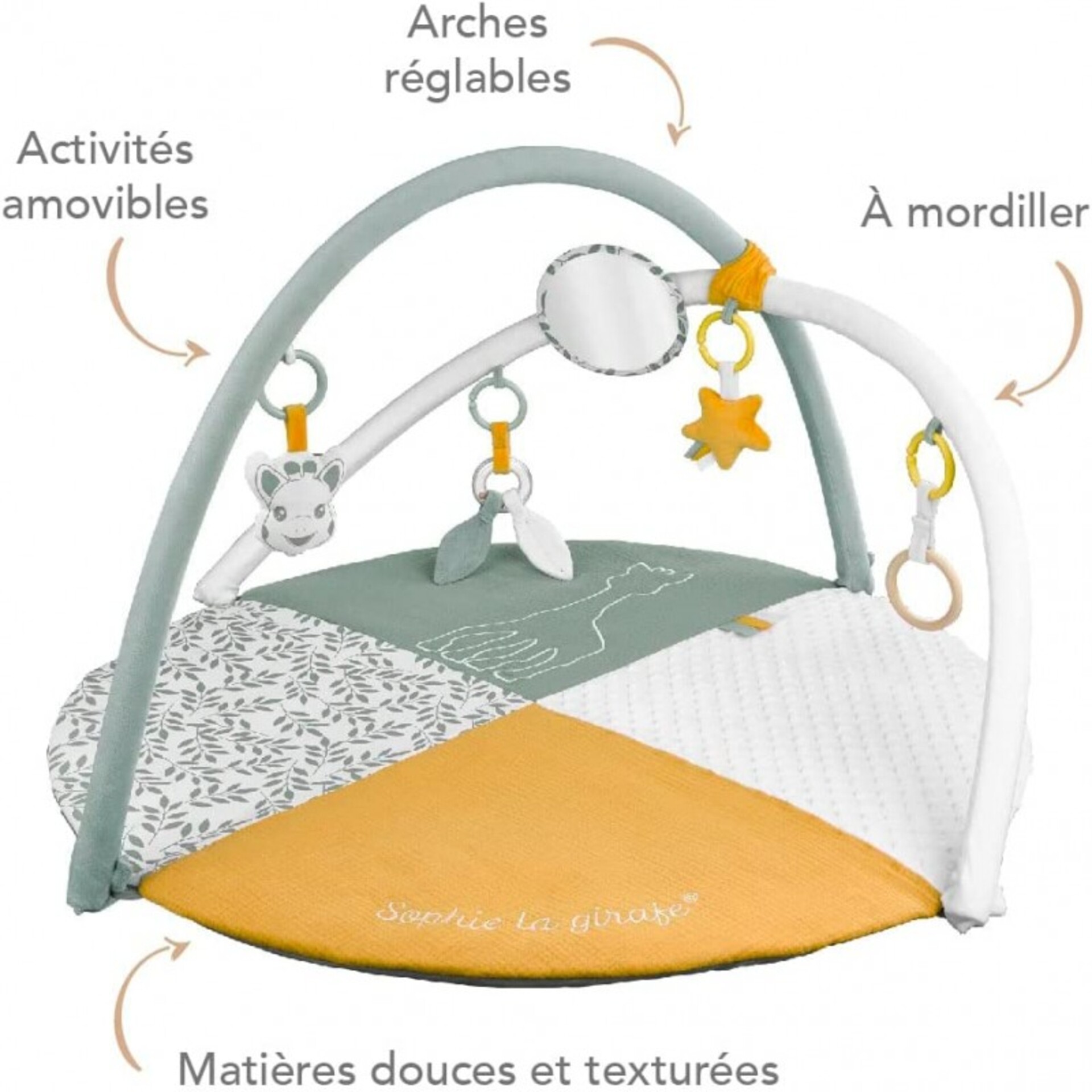 Les 2 arches réglables permettent de modifier la position des activités pour inciter bébé à tourner la tête et se muscler.