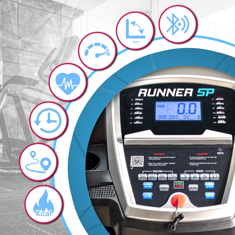 Ce tapis de course haute performance est idéal pour s'entrainer à la maison ou au bureau, le tapis RSP s'adapte à tous les niveaux grâce à son mode de vitesse réglable, sa fonction inclinable motorisée jusqu'à 15% et ses 12 programmes.