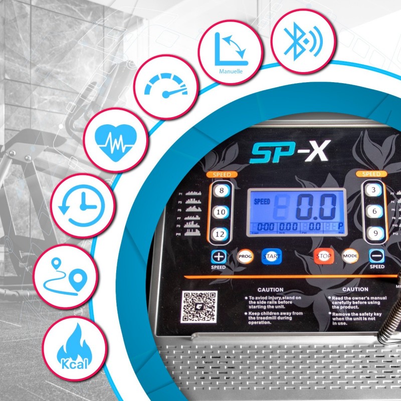 Ce tapis de course haute performance est idéal pour s'entrainer à la maison ou au bureau, le tapis SPX s'adapte à tous les niveaux grâce à son mode de vitesse réglable, sa fonction inclinable et ses 12 programmes.