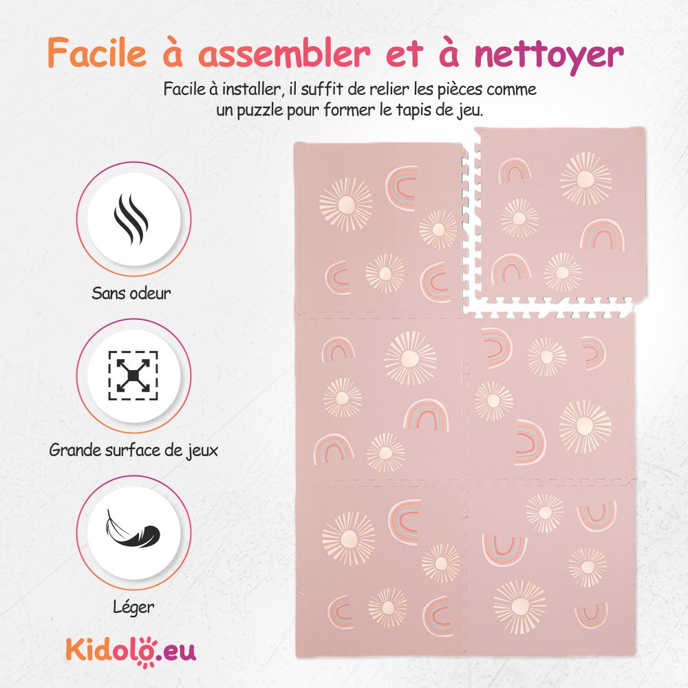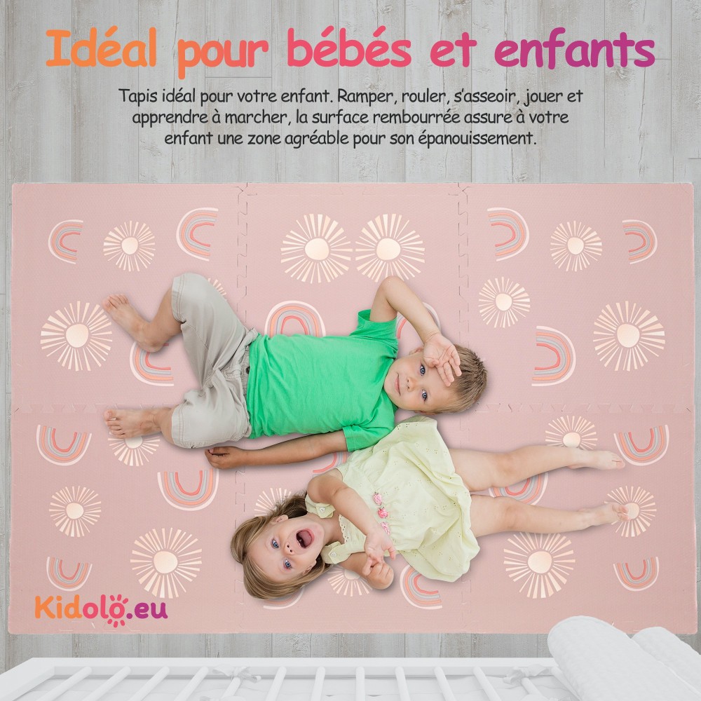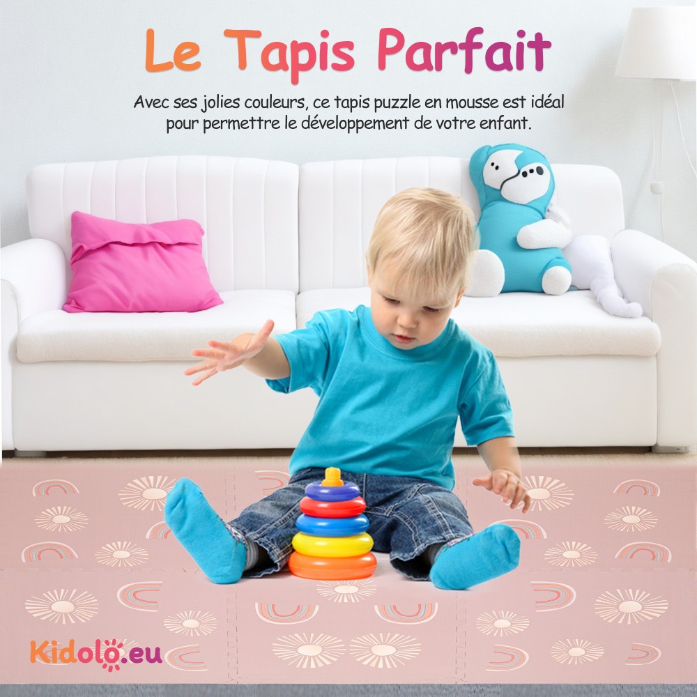 Notre tapis, disponible dans une variété de motifs, ajoutera une touche de couleurs à l'espace de jeu de votre enfant. Les couleurs vives améliorent la vision de votre bébé et stimulent ses sens.