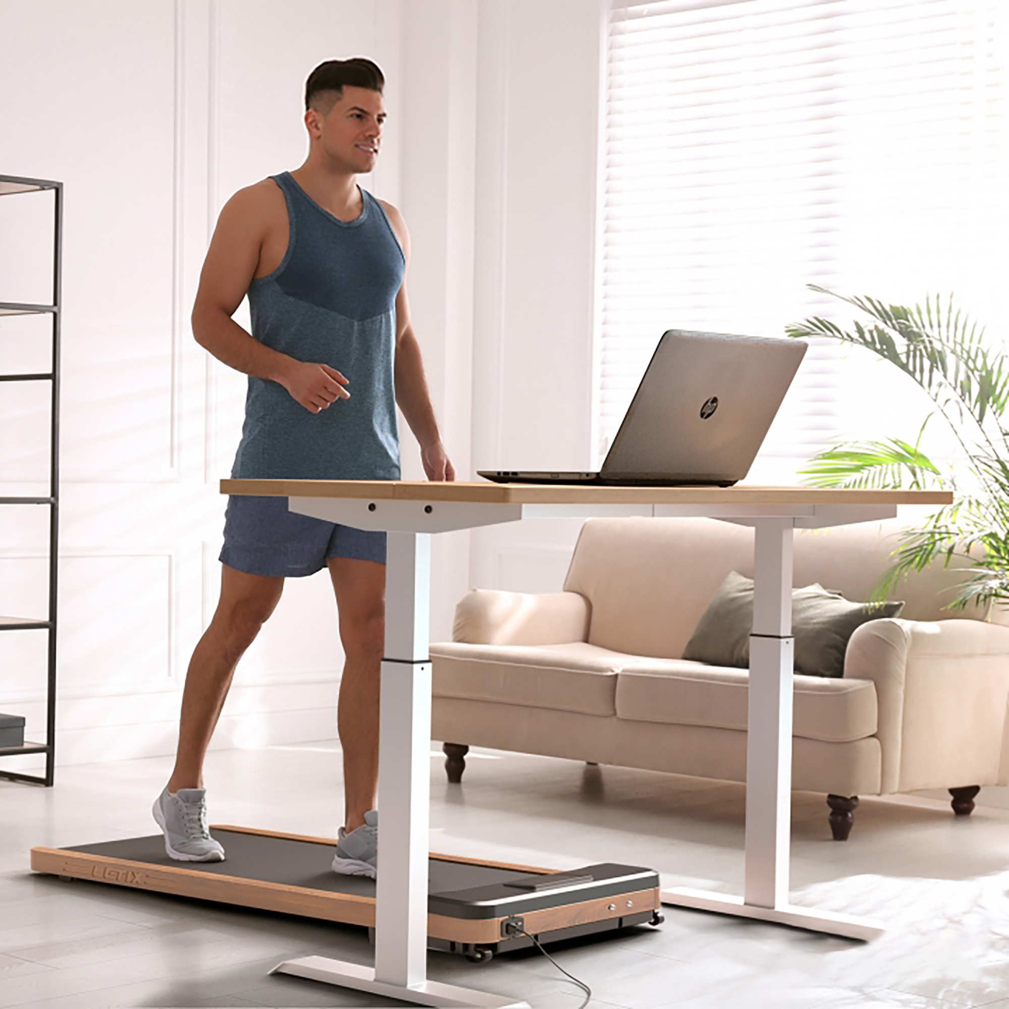 Le Deskwalk est le tapis de marche idéal pour tous. Équipé d'un moteur électrique à faible consommation d'énergie, ce tapis peut atteindre une vitesse maximale de 6 km/h. Ce tapis est spécialement conçu pour préserver les articulations : genoux et chevilles, offrant ainsi une expérience douce et confortable. La surface de marche est conçue pour être peu bruyante et antidérapante, assurant ainsi une stabilité optimale pendant l'exercice. L'écran LCD intégré fournit toutes les informations essentielles sur votre entraînement, notamment le temps écoulé, la vitesse actuelle et les calories brûlées. Pour varier vos sessions, le Deskwalk360 propose 12 programmes d'entraînement préinstallés, simulant différentes sections de parcours et permettant d'augmenter progressivement la vitesse. Avec une hauteur de seulement 12 cm, le tapis de course se range facilement sous un lit, un canapé ou derrière une porte. Les roulettes intégrées facilitent le déplacement du tapis, vous permettant de le transporter sans effort où que vous soyez. En résumé, le Deskwalk combine performance, confort et praticité, en faisant le choix parfait pour ceux qui cherchent à s'entraîner efficacement à domicile tout en prenant soin de leurs articulations. Dimensions produit (L. x l. x H. cm) 120 x 54 x 12 cm Poids produit (kg) 20 kg Nombre d'utilisateurs conseillé 1 Poids maximum recommandé (kg) 120 kg Vitesse réglable de 1 à 6 km/h Poids carton (kg) 25 kg Dimensions colis 131 x 64 x 17 cm Conseil d'utilisation : Réalisez un échauffement préalable avec des étirements avant de commencer et à la fin de votre séance, pour éviter de vous faire mal. Pour une installation optimale, il est recommandé de placer un tapis de sol sous l’appareil.