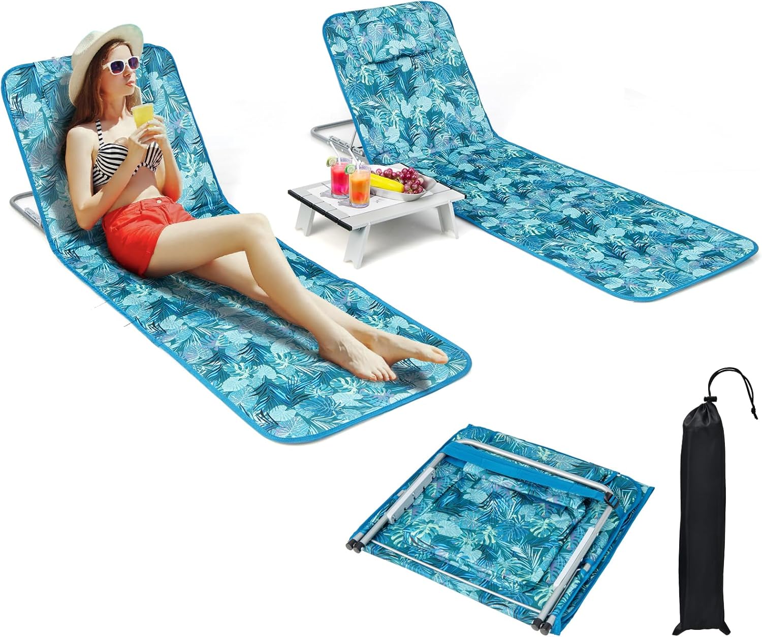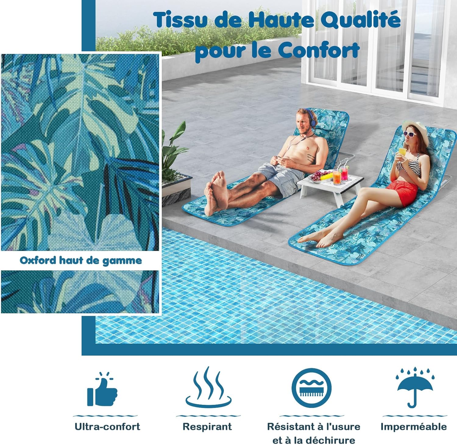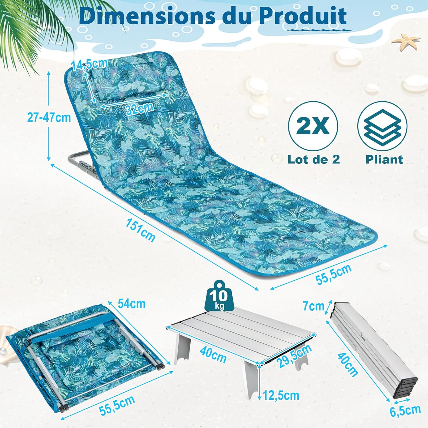 Tapis de plage pliables lot de 2 avec petite table, matelas de plage inclinable en 5 positions&appui-tête