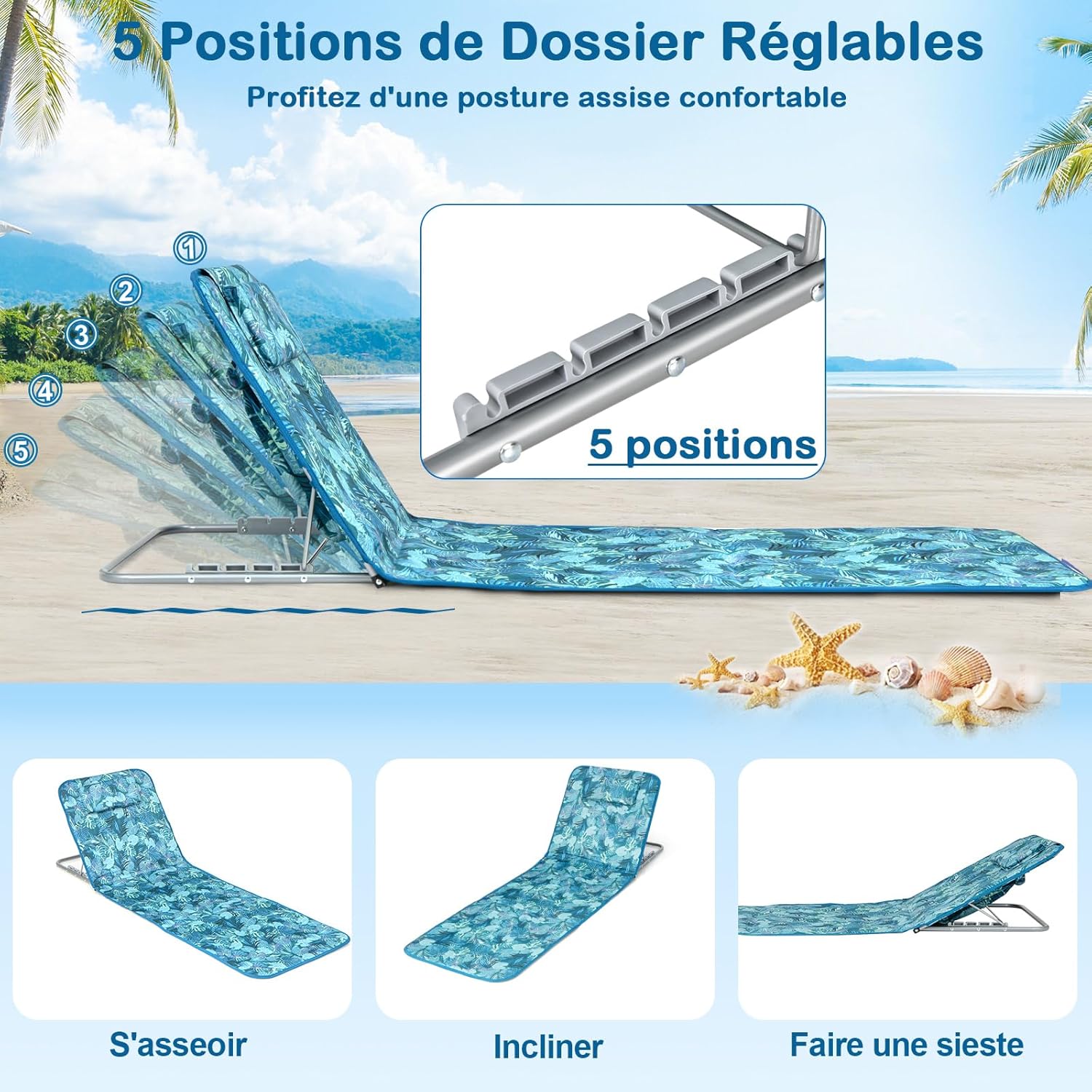 - Réglage personnalisé - Ce matelas de plage est doté d'un dossier inclinable réglable à cinq positions qui vous permet de vous asseoir, de vous allonger ou de vous incliner en tout confort. Que vous souhaitiez prendre un bain de soleil, lire un livre ou faire une sieste, il sera le choix idéal pour vous.
