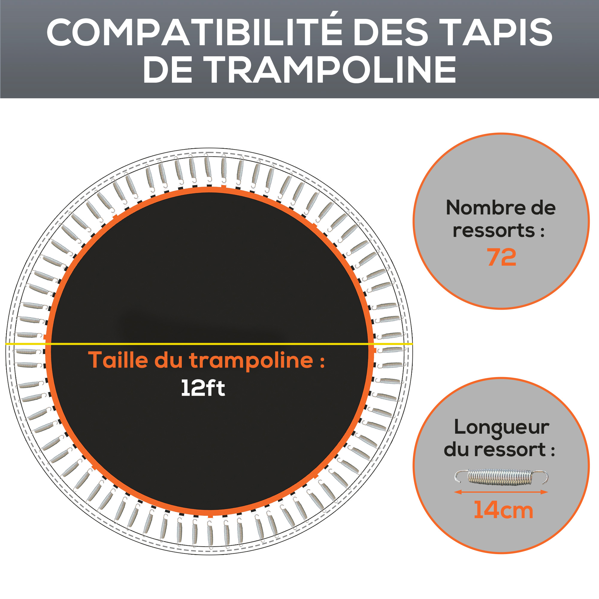 - Convient au trampoline rond de 12 pieds avec 72 anneaux en V, utilisant des ressorts de 14 cm