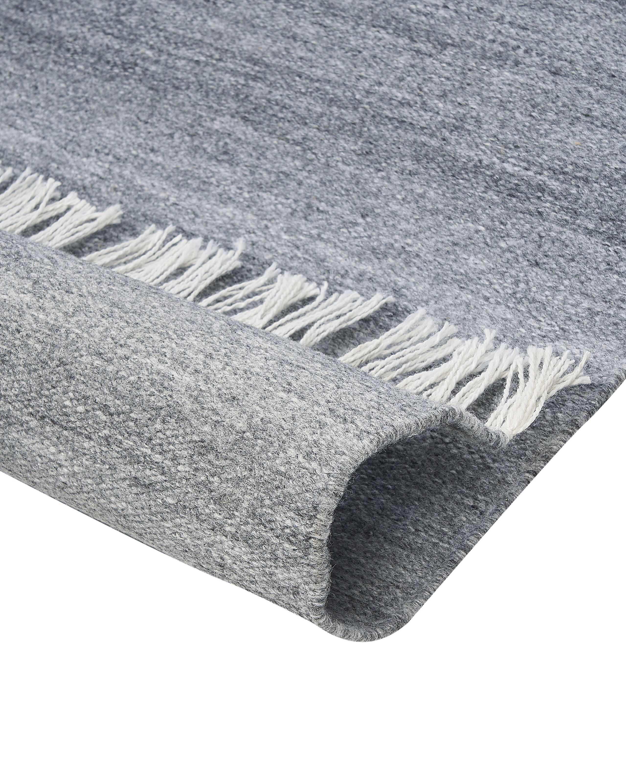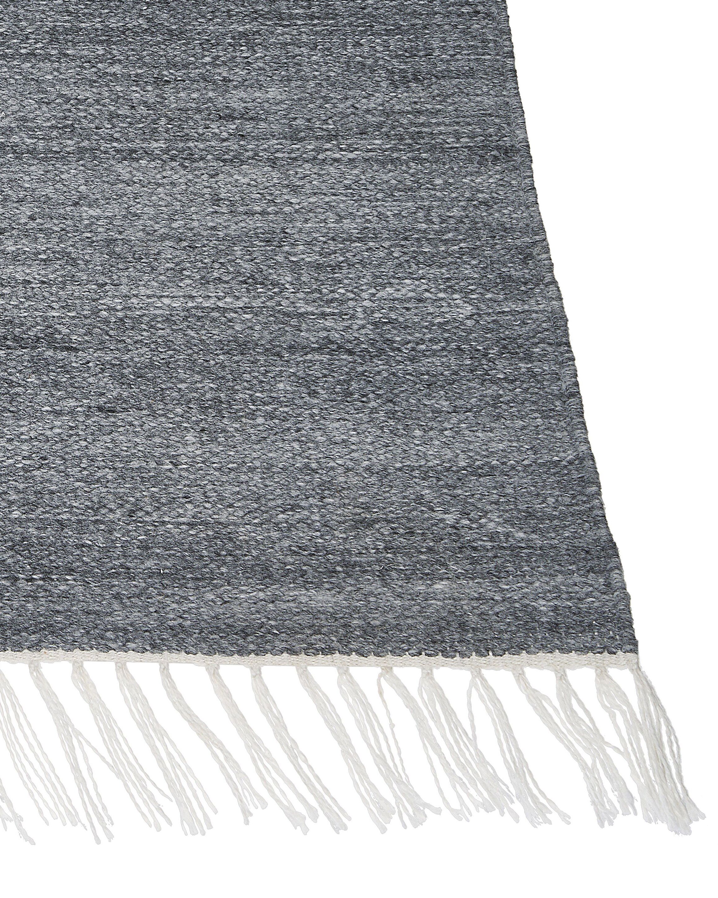Tapis à franges unicolore. Un tel tapis est la touche finale parfaite d'un intérieur ou d'un espace extérieur comme une terrasse ou un patio. Tissé à la main à partir de fibres plastiques recyclées, il est facile à nettoyer et durable, ce qui le rend adapté aux zones à fort trafic. Les tapis en fibres synthétiques sont une bonne solution pour les maisons avec des animaux domestiques et les personnes allergiques, car ils n'accumulent pas la poussière. Cette pièce tissée à plat présente une texture semblable à celle de la laine, agréable au toucher, et grâce à sa couleur neutre, elle peut être facilement assortie à de nombreux styles d'intérieur.