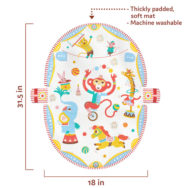 Un tapis d'éveil 3 en 1 sur le thème du cirque avec de nombreux accessoires. Il comprend deux figurines en peluche : un singe génial et un adorable éléphant, un manège et un grand miroir sans danger pour bébé qui peut être accroché ou posé sur le tapis. Le mobile magique motorisé 2 en 1 est adapté à plusieurs étapes du développement de votre bébé. Lay and Play - Positionnez la piste du mobile entre les arches. Fixez les accessoires aux arceaux ou au mobile suspendu au dessus de votre bébé. Au fur et à mesure que le mobile circule entre les arceaux, son mouvement fera naturellement tourner sur lui-même l'accessoire qui lui est relié. Maximisez cette étape lorsque votre bébé est allongé sur le dos, en le plaçant perpendiculairement à la piste du mobile au-dessus, puis plus tard, parallèlement à celle-ci pour élargir davantage son champ de vision. Tummy-Time - Fixez la piste du mobile au tapis. Placez l'une des figurines sur le mobile motorisé pendant qu'il se déplace d'un côté à l'autre, encourageant votre bébé à lever les yeux. Soutenez votre bébé avec ce joyeux oreiller double face, tente à grand toit, pour passer du temps sur le ventre. Asseyez-vous et jouez - Lorsque votre bébé commence à s'asseoir, favorisez le temps de jeu indépendant en séparant les arches de la surface, permettant à votre bébé de s'asseoir confortablement et de jouer avec le mobile connecté au tapis. Pendant que le mobile motorisé roule, il jouera de la musique stimulante ou relaxante pendant dix minutes avant de se taire. Il peut également être en mode muet. Ouvrez et fermez facilement le tapis dans l'étui de transport autonome pour le rangement ou pour le voyage, en conservant son hygiène et sa propreté lorsqu'il se replie vers l'intérieur. Le tapis mesure 39,4 x 27,5 pouces (100 x 70 cm) et dispose de verrous de sécurité semi-automatisés.