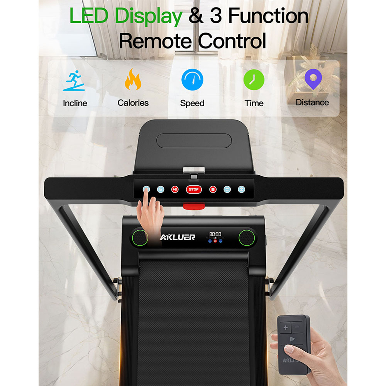Écran LED multifonction et télécommande Le tapis de course pliable Akluer est équipé d'un écran LED multifonction qui affiche la vitesse, la distance, le temps et les calories en temps réel. Vous pouvez régler votre vitesse via l'écran tactile, la télécommande et la télécommande portable. La télécommande portable se branche sur le côté droit du tapis de course, ce qui la rend plus sûre à utiliser.