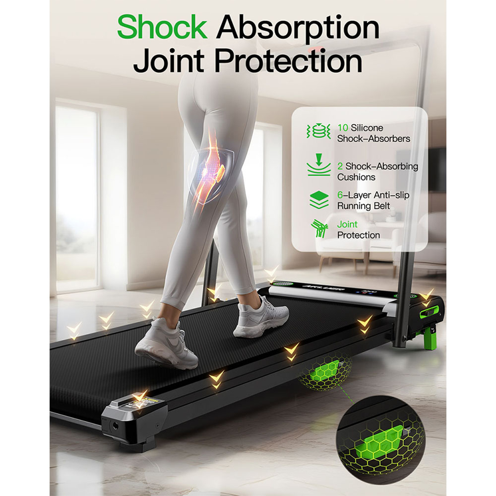 Bande de course antidérapante et système de réduction des chocs Le tapis de course pour la maison est conçu pour offrir une zone de course spacieuse de 16,1" * 39,37" avec une ceinture antidérapante à 6 couches, 10 amortisseurs en silicone et 2 coussins d'absorption des chocs, il aide à absorber les chocs et à réduire le bruit, rendant votre course plus silencieuse et plus stable, il réduit l'impact sur votre corps, assurant la protection des genoux, des muscles et des articulations pendant la course.