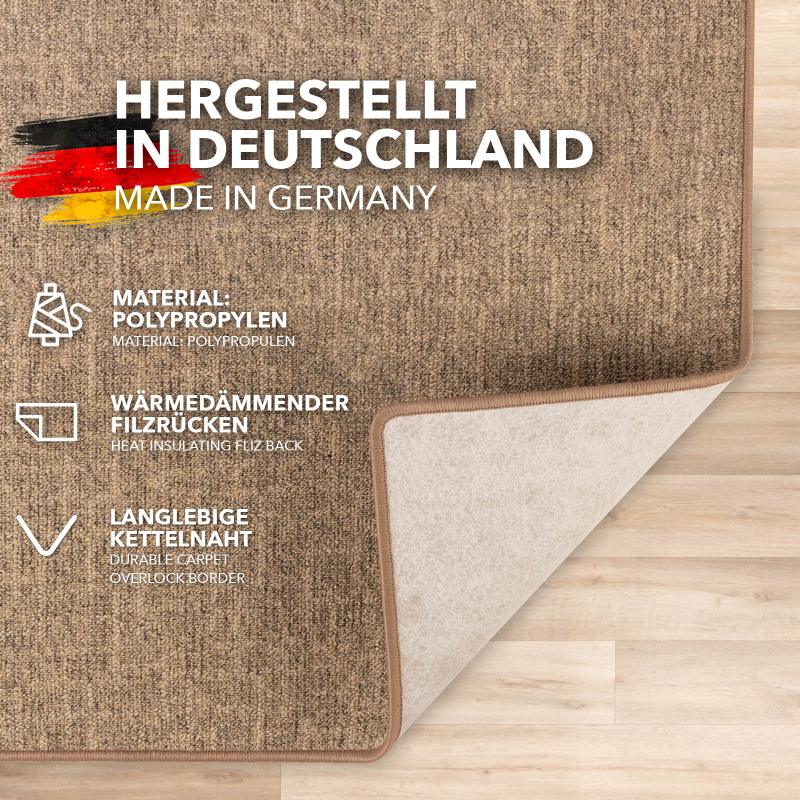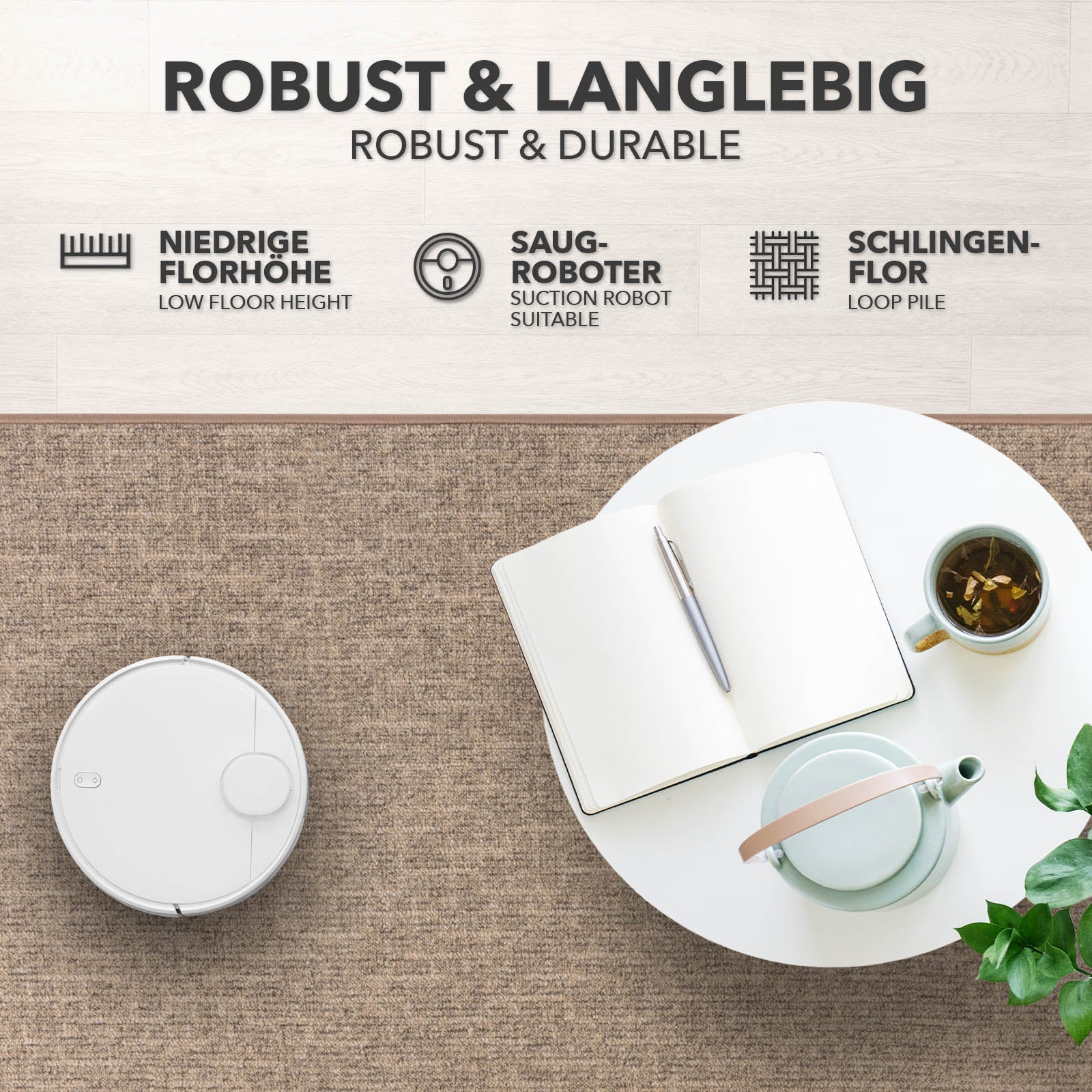 Conçu en polypropylène bouclé durable avec une faible hauteur de poil, le tapis "Alto" est parfaitement compatible avec les robots aspirateurs et se distingue également par ses propriétés insonorisantes et antiallergiques, offrant un confort supplémentaire tout en améliorant la qualité de l'air intérieur. Sa texture résistante et facile d'entretien en fait un choix idéal pour toutes les pièces de votre maison. En complément de votre tapis sur mesure, explorez notre boutique en ligne pour découvrir les tapis d’escalier "Alto" dans des designs semi-circulaires ou carrés, parfaitement assortis. Fabriqué en Allemagne avec un dos en feutre textile et une épaisseur totale d'environ 8 mm, le tapis est disponible en longueurs variant de 100 cm à 3000 cm et en largeurs de 67 cm à 240 cm. Il convient aux sols chauffants et est conçu pour résister aux allergies. Veuillez noter que des tolérances dimensionnelles de 1 à 3 % ainsi que de légères variations de couleur et de texture peuvent apparaître, en raison des différences de production et d'affichage. Les tapis sur mesure étant fabriqués spécialement pour vous, les échanges et retours ne sont pas possibles.- Dos: feutre textile