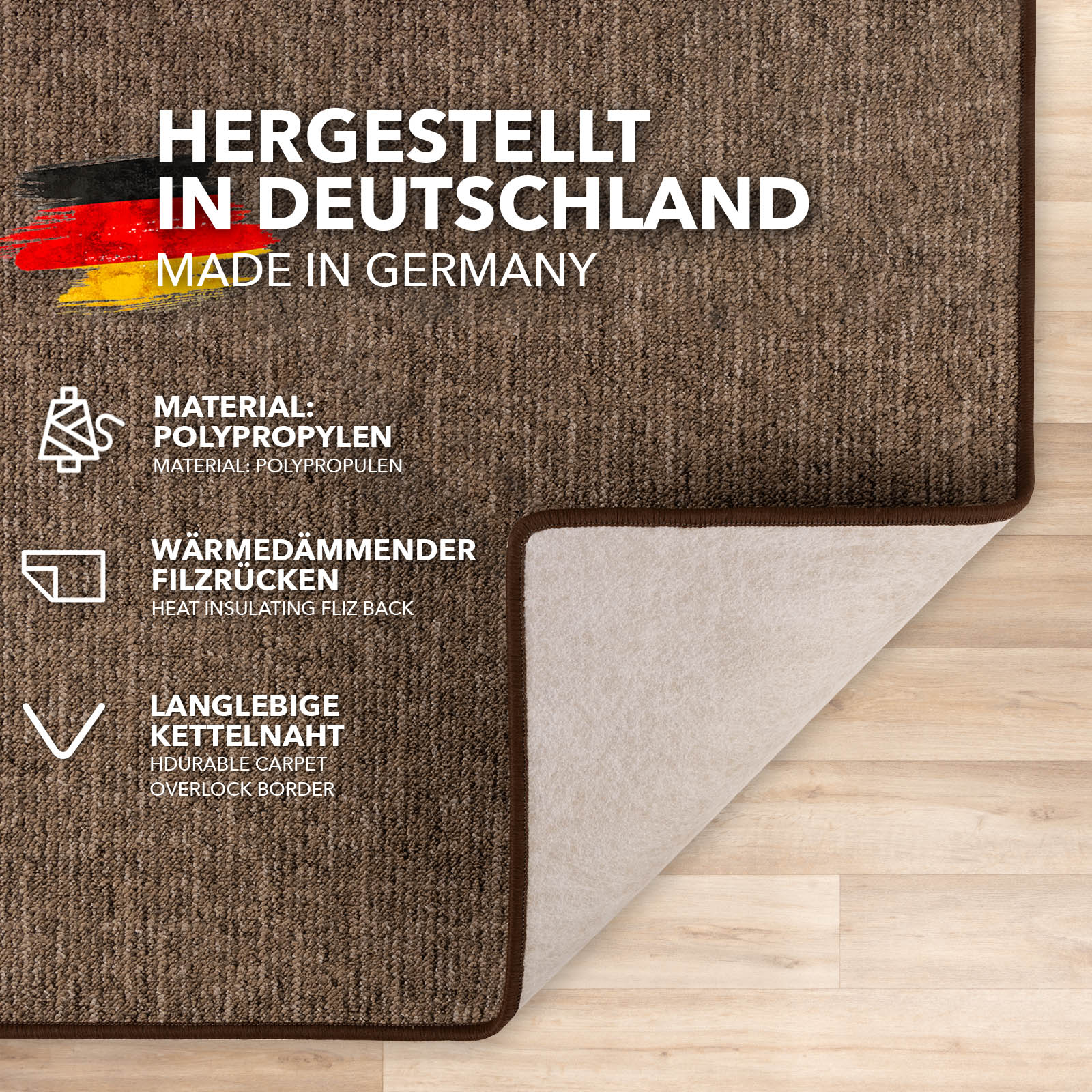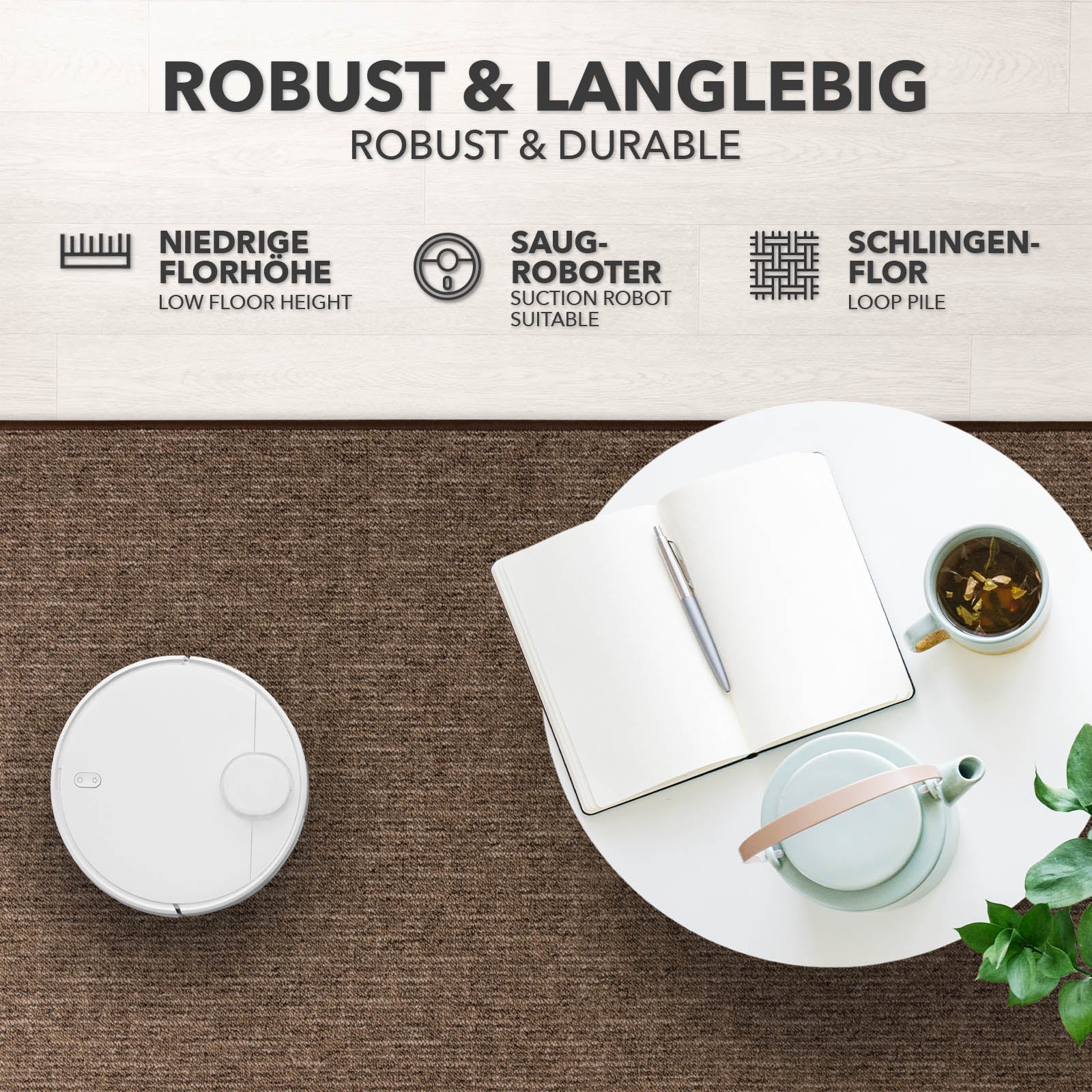 Conçu en polypropylène bouclé durable avec une faible hauteur de poil, le tapis "Alto" est parfaitement compatible avec les robots aspirateurs et se distingue également par ses propriétés insonorisantes et antiallergiques, offrant un confort supplémentaire tout en améliorant la qualité de l'air intérieur. Sa texture résistante et facile d'entretien en fait un choix idéal pour toutes les pièces de votre maison. En complément de votre tapis sur mesure, explorez notre boutique en ligne pour découvrir les tapis d’escalier "Alto" dans des designs semi-circulaires ou carrés, parfaitement assortis. Fabriqué en Allemagne avec un dos en feutre textile et une épaisseur totale d'environ 8 mm, le tapis est disponible en longueurs variant de 100 cm à 3000 cm et en largeurs de 67 cm à 240 cm. Il convient aux sols chauffants et est conçu pour résister aux allergies. Veuillez noter que des tolérances dimensionnelles de 1 à 3 % ainsi que de légères variations de couleur et de texture peuvent apparaître, en raison des différences de production et d'affichage. Les tapis sur mesure étant fabriqués spécialement pour vous, les échanges et retours ne sont pas possibles.- Dos: feutre textile
