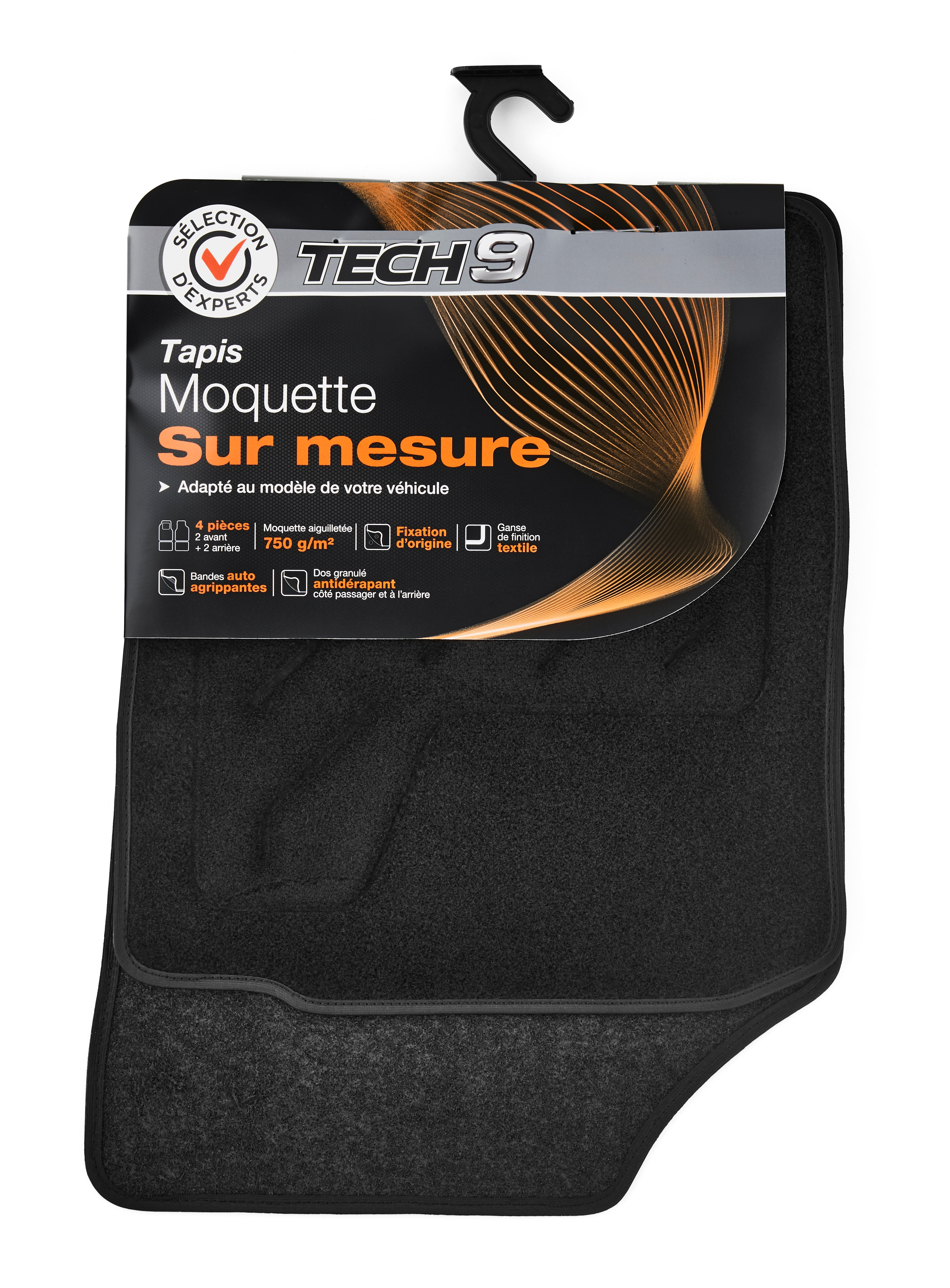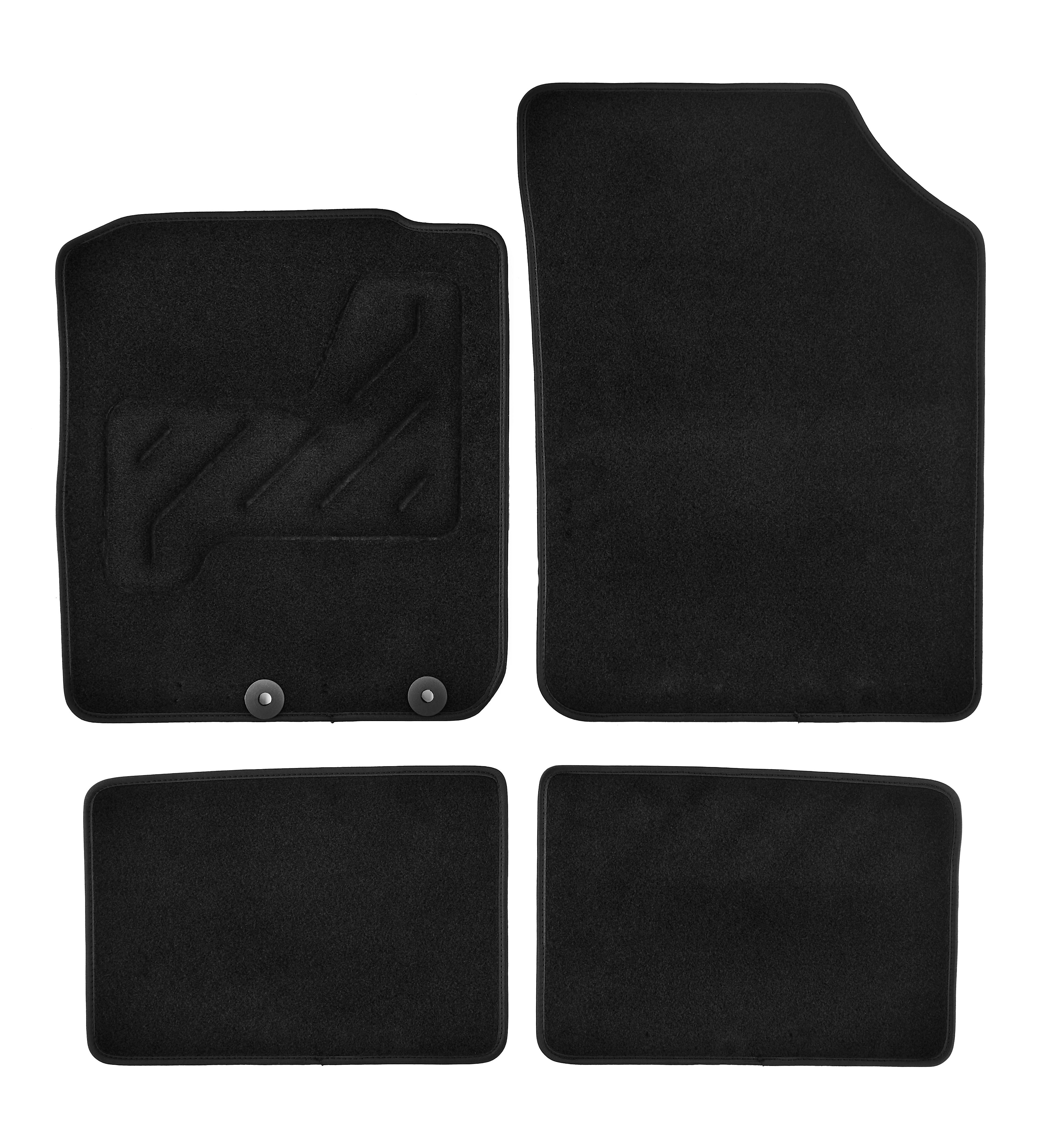 Moquette aiguilletée 750 g/m² Talonnette renforcée et ganse textile Mousse antidérapante côté conducteur Dos granulé côté passager et à l'arrière Clips de fixation d'origine